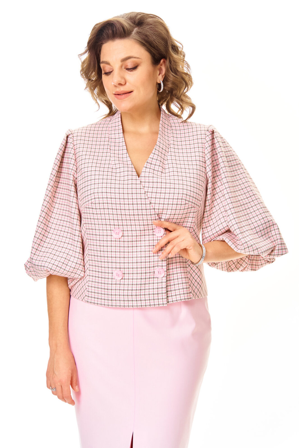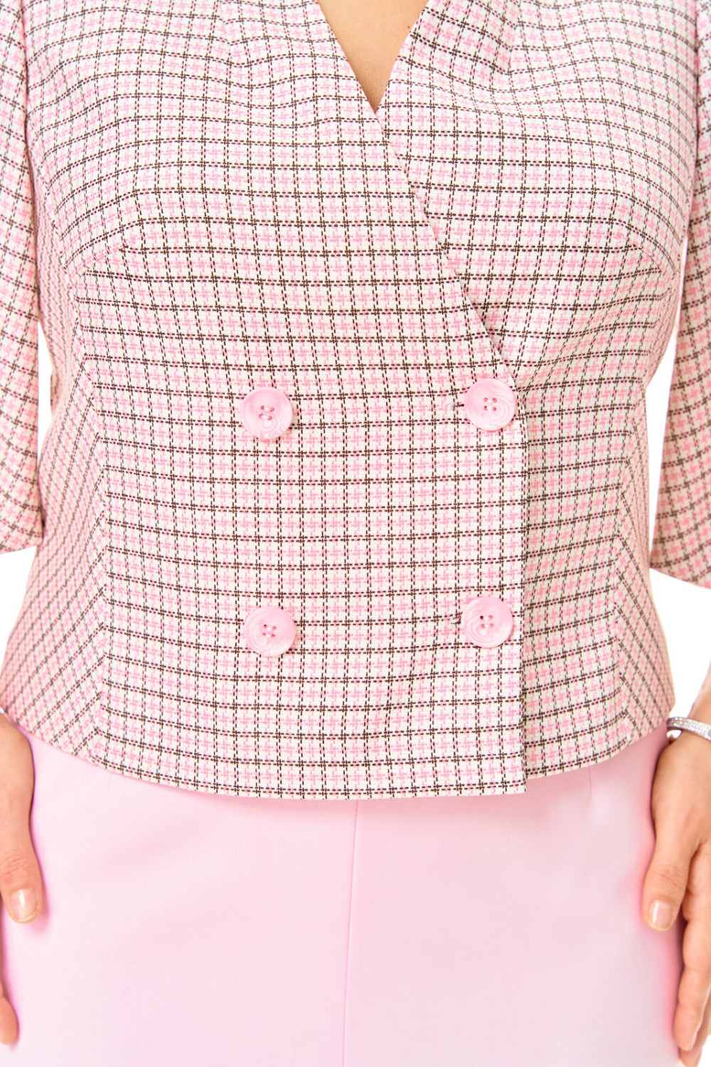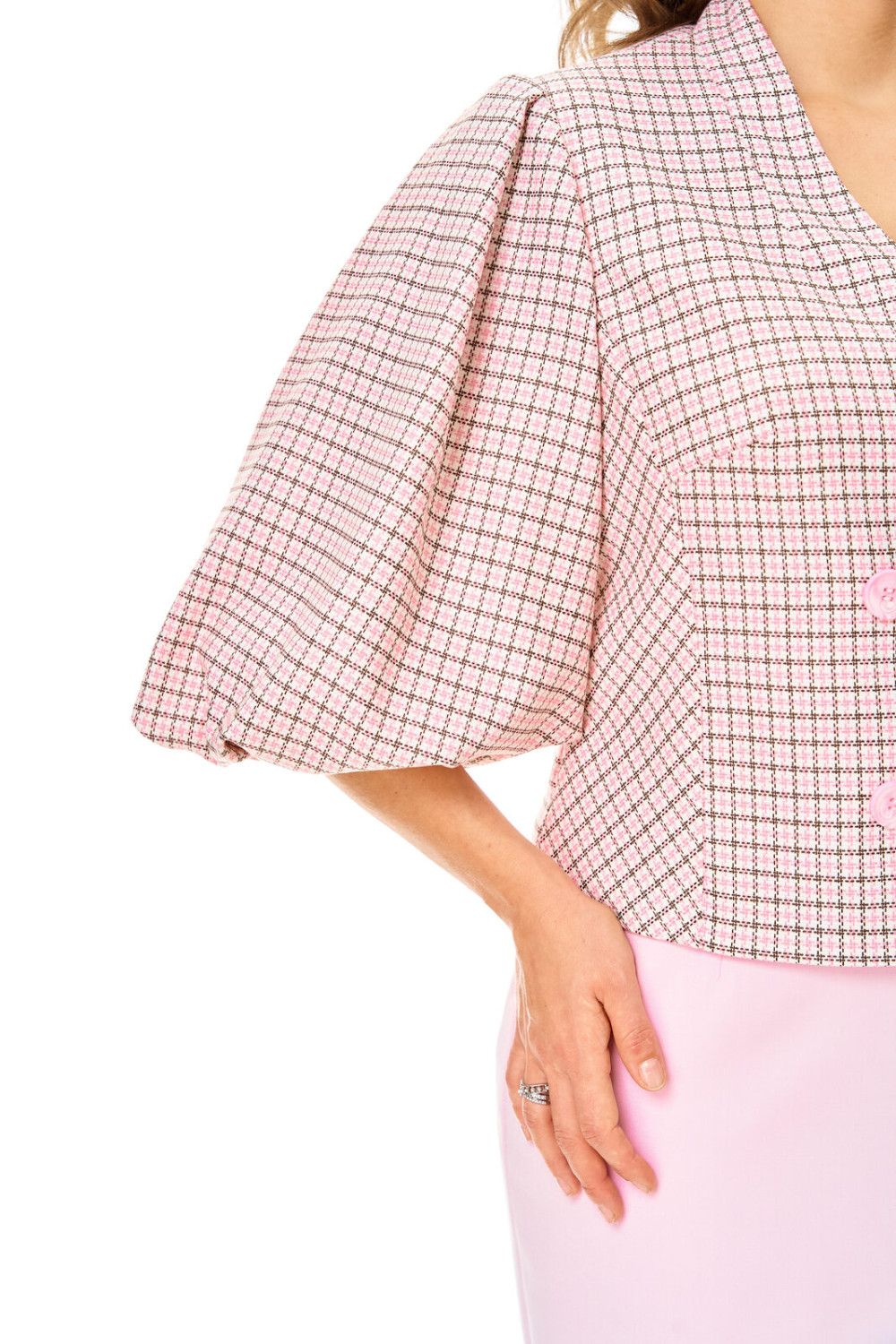 Жакет полуприлегающего силуэта на подкладке, укороченный. Застежка двубортная на петли-пуговицы. Перед с рельефом из проймы и нагрудной вытачкой. Перед выполнен с цельнокроеной стойкой переходящей в горловину спинки. Рукав втачной одношовный типа "баллон", с декоративными складками по окату и низу.