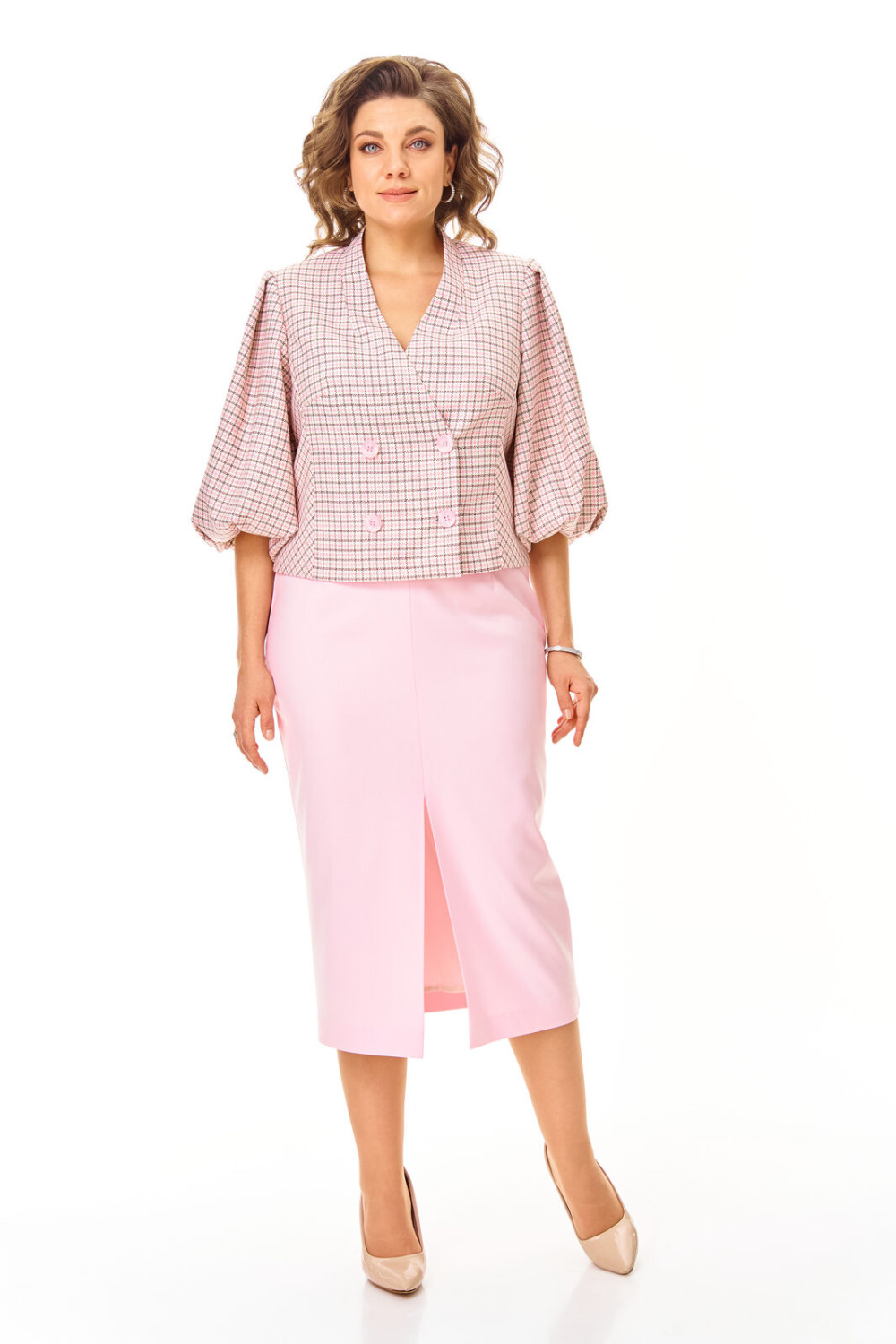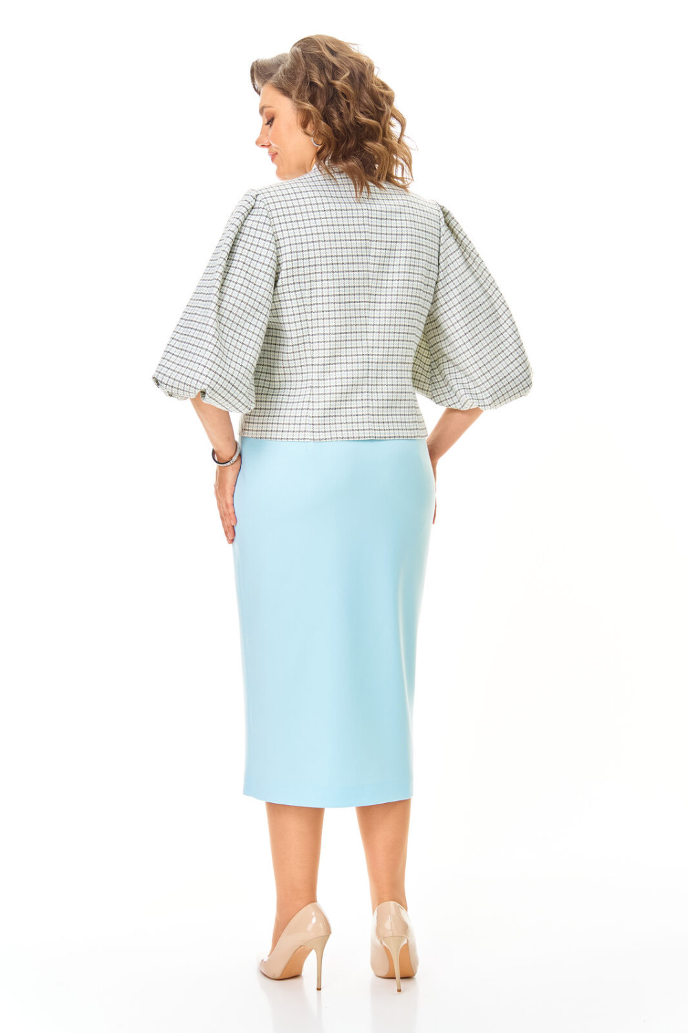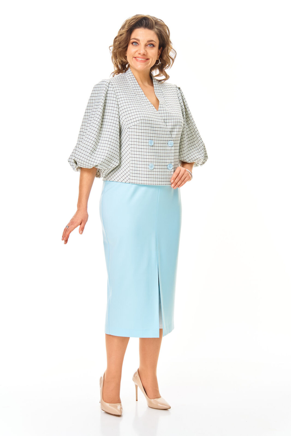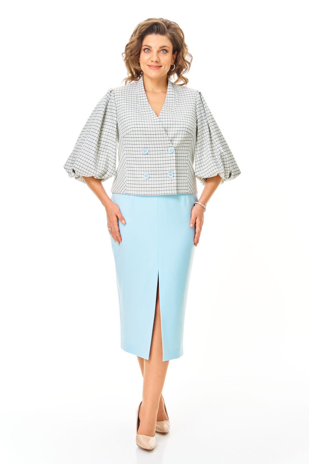 Жакет полуприлегающего силуэта на подкладке, укороченный. Застежка двубортная на петли-пуговицы. Перед с рельефом из проймы и нагрудной вытачкой. Перед выполнен с цельнокроеной стойкой переходящей в горловину спинки. Рукав втачной одношовный типа "баллон", с декоративными складками по окату и низу.