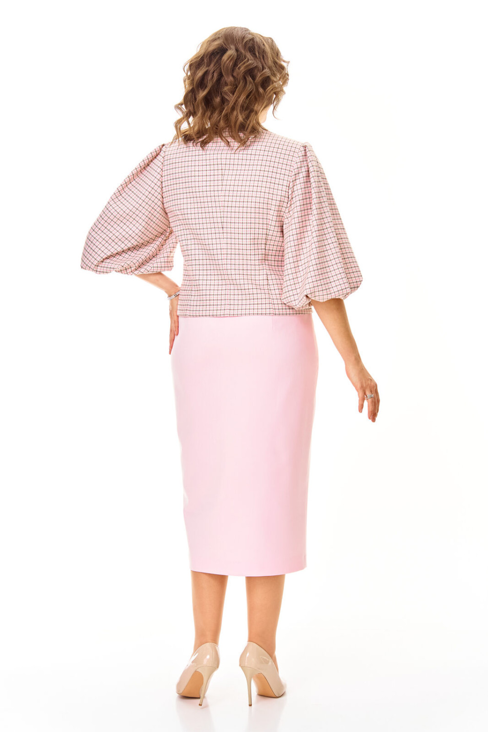 Юбка на подкладке зауженная книзу. В среднем шве переда выполнен разрез. Пояс притачной с резинкой в боковых швах. Застежка в бок шве на потайную тесьму-молнию и петлю-пуговицу.