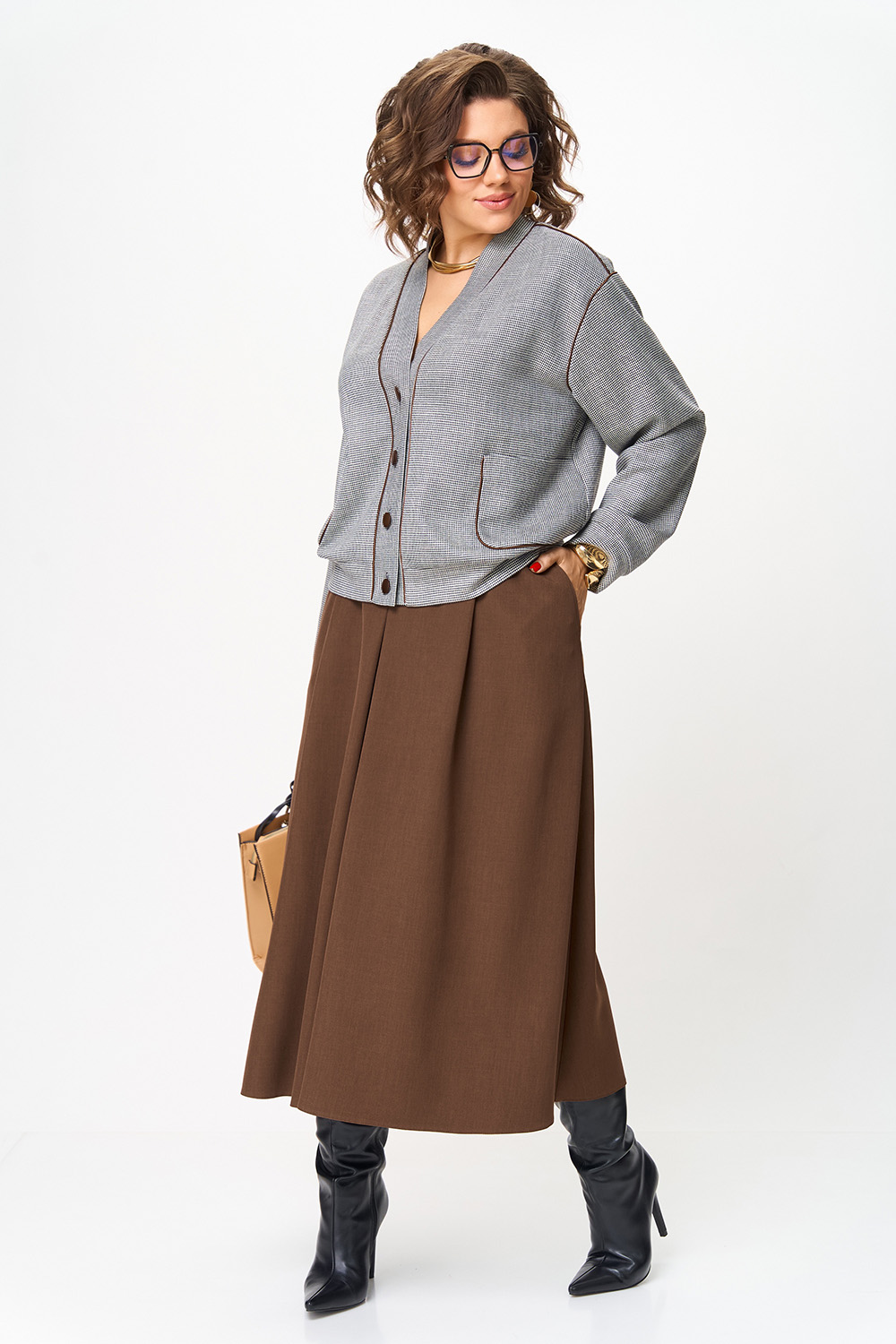 Этот костюм — воплощение интеллектуальной элегантности. Мягкий светло-серый кардиган с коричневыми кантами и крупными пуговицами создаёт образ уютного шарма. V-образный вырез визуально вытягивает шею, а контрастные детали подчёркивают чёткость линий. Рукав на спущенной пройме и манжетой по низу. По переду накладные карманы с декоративной нашивкой. Коричневая юбка миди с глубокими встречными складками и разрезом по переду добавляет образу женственности. В боковых швах карманы. Юбка на подкладке. Для максимально комфортной посадки по бокам пояса вставлена эластичная резинка.
