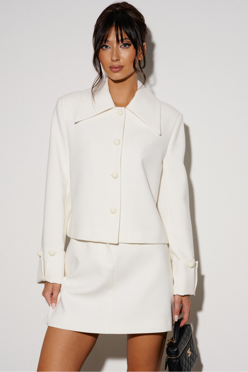 Юбка А-силуэта, выполнена из костюмной ткани белого цвета. Характеристики: пояс стабильный, застёжка центральная пуговица и потайная молния, по переду выточки, на подкладке. Длина изделия по боковому шву 43 см.
