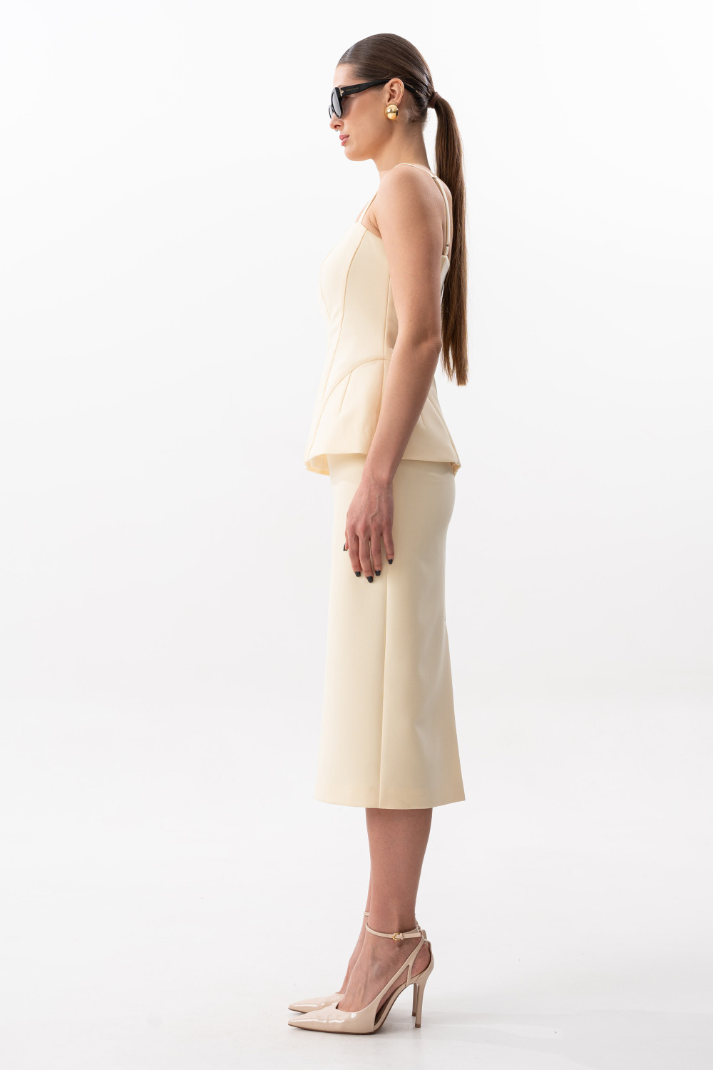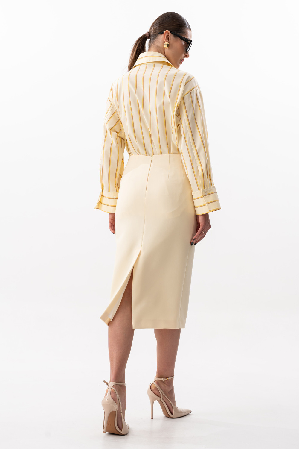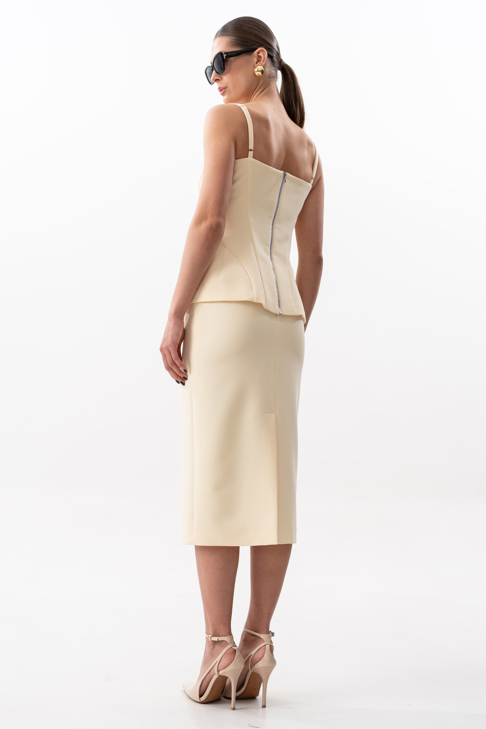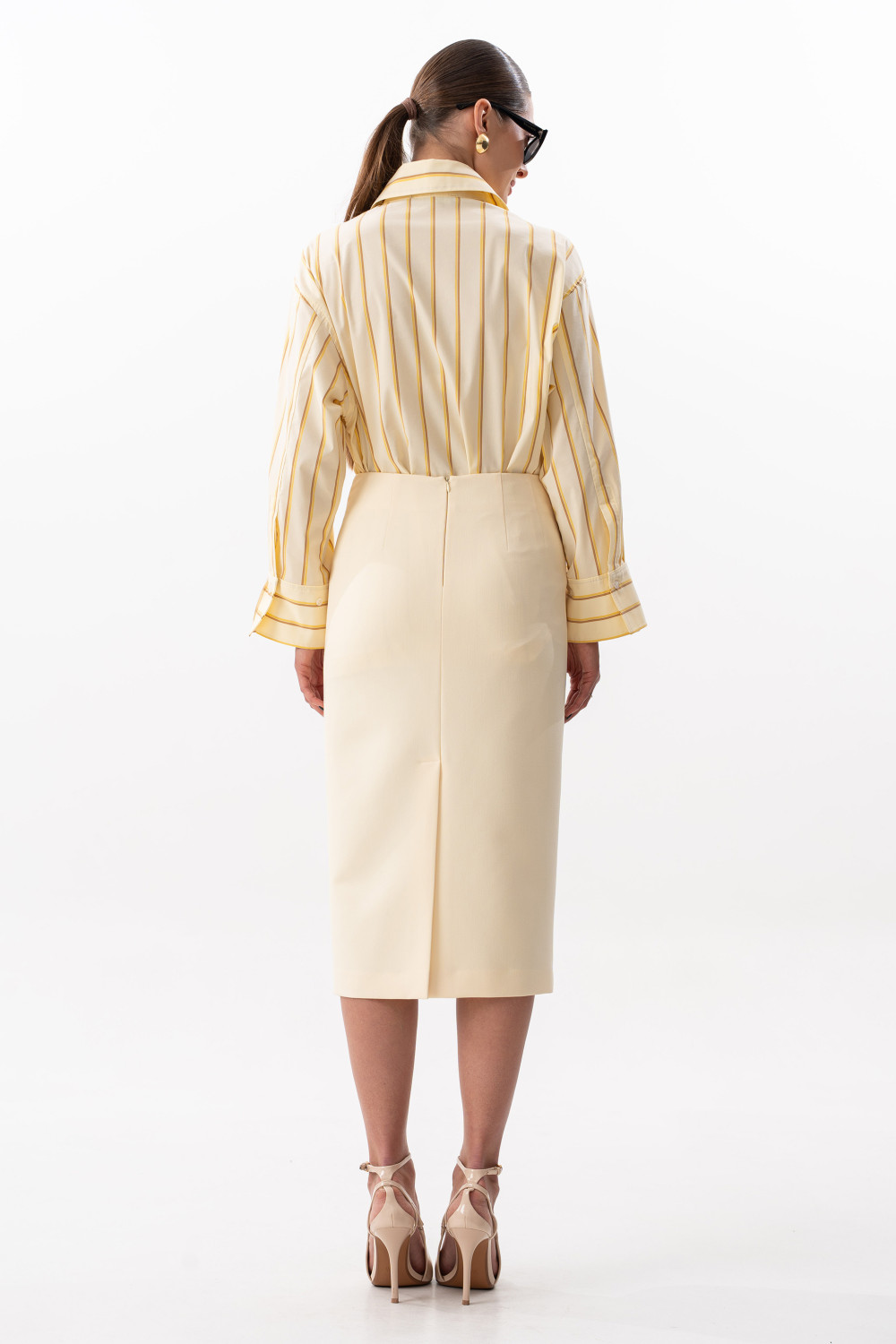Стильная юбка миди прямого кроя. Выполнена из костюмной ткани, на поливискозной подкладке. Пояс-обтачка, в среднем шве заднего полотна застежка- потайная молния. На передней части юбки настрочена декоративная бирка.