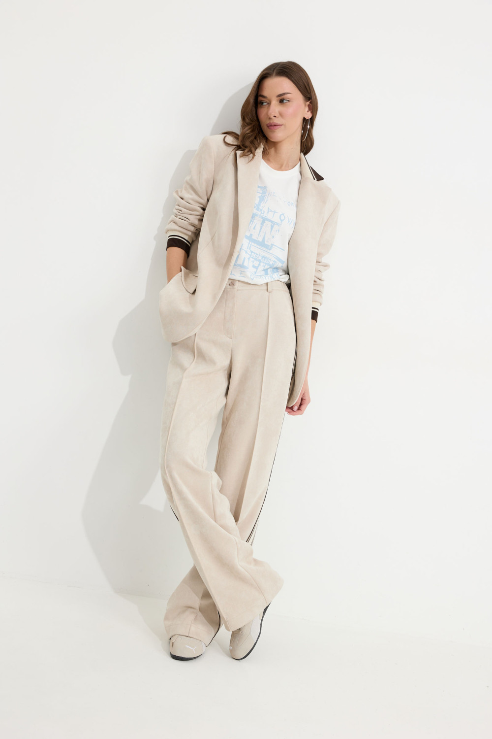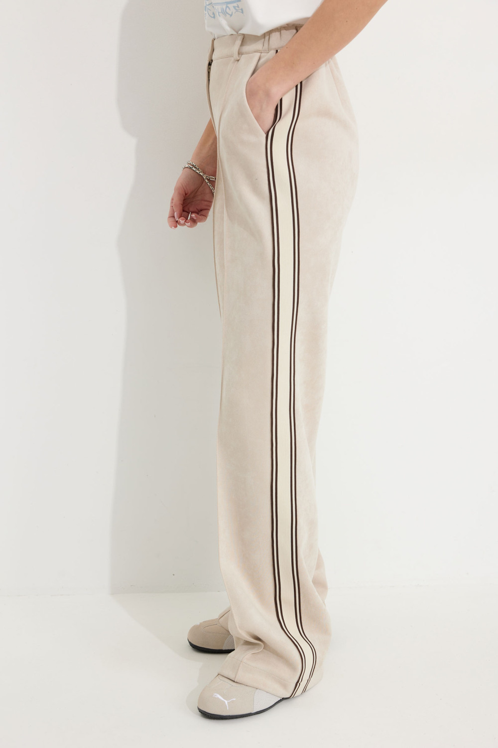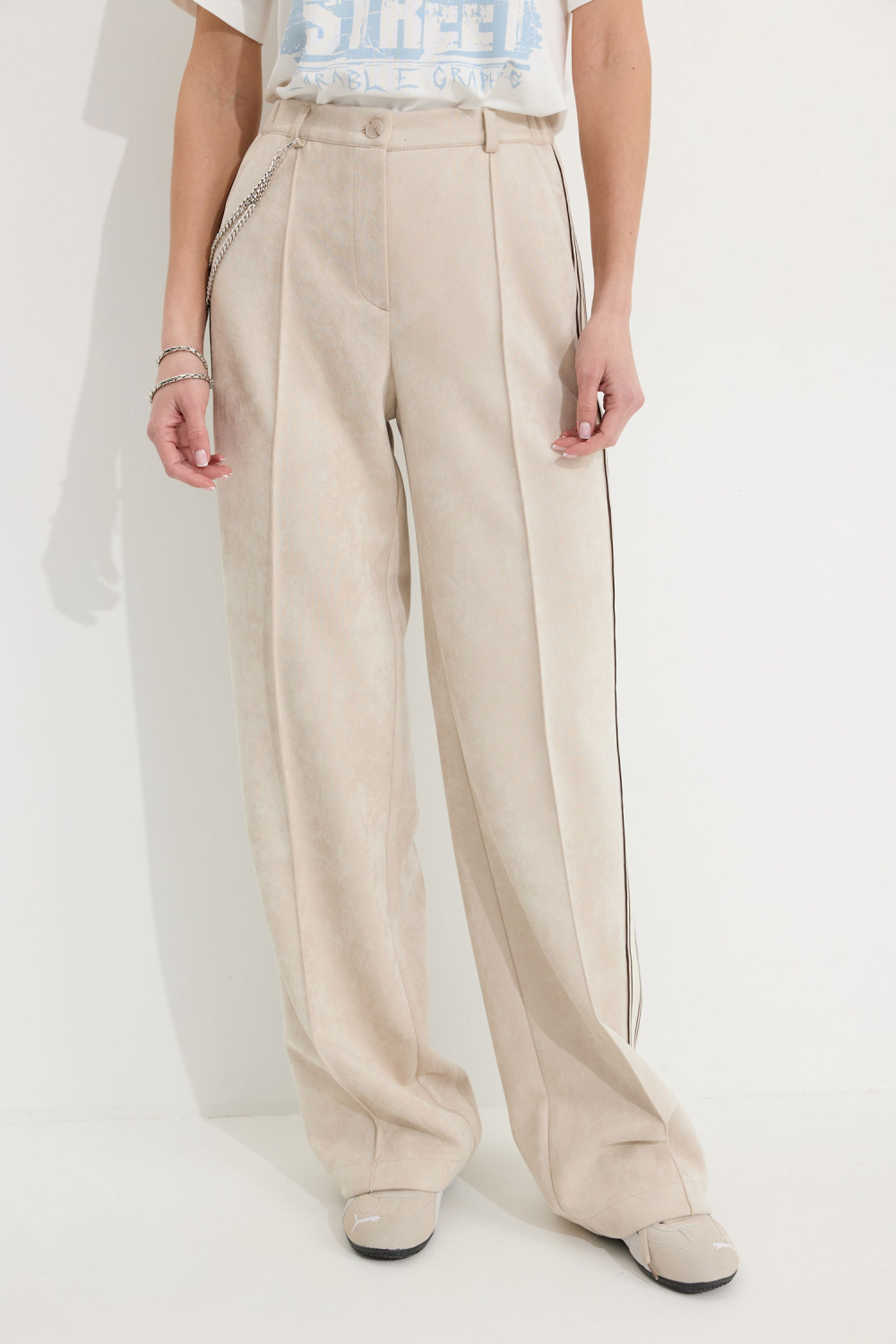 Брюки прямого силуэта из трикотажного полотна “замша”. По верху притачной пояс с застежкой на петлю и пуговицу и шлевками для ремня. На передних половинках обработаны карманы, канты и застежка молния в среднем шве, на задних – вытачки. По поясу задних половинок брюк эластичная тесьма(резинка) . Вдоль бокового шва брюк лампас.Обращаем ваше внимание, что фурнитура может отличаться от фото. Декоративный элемент - цепочка в комплектацию не входит.