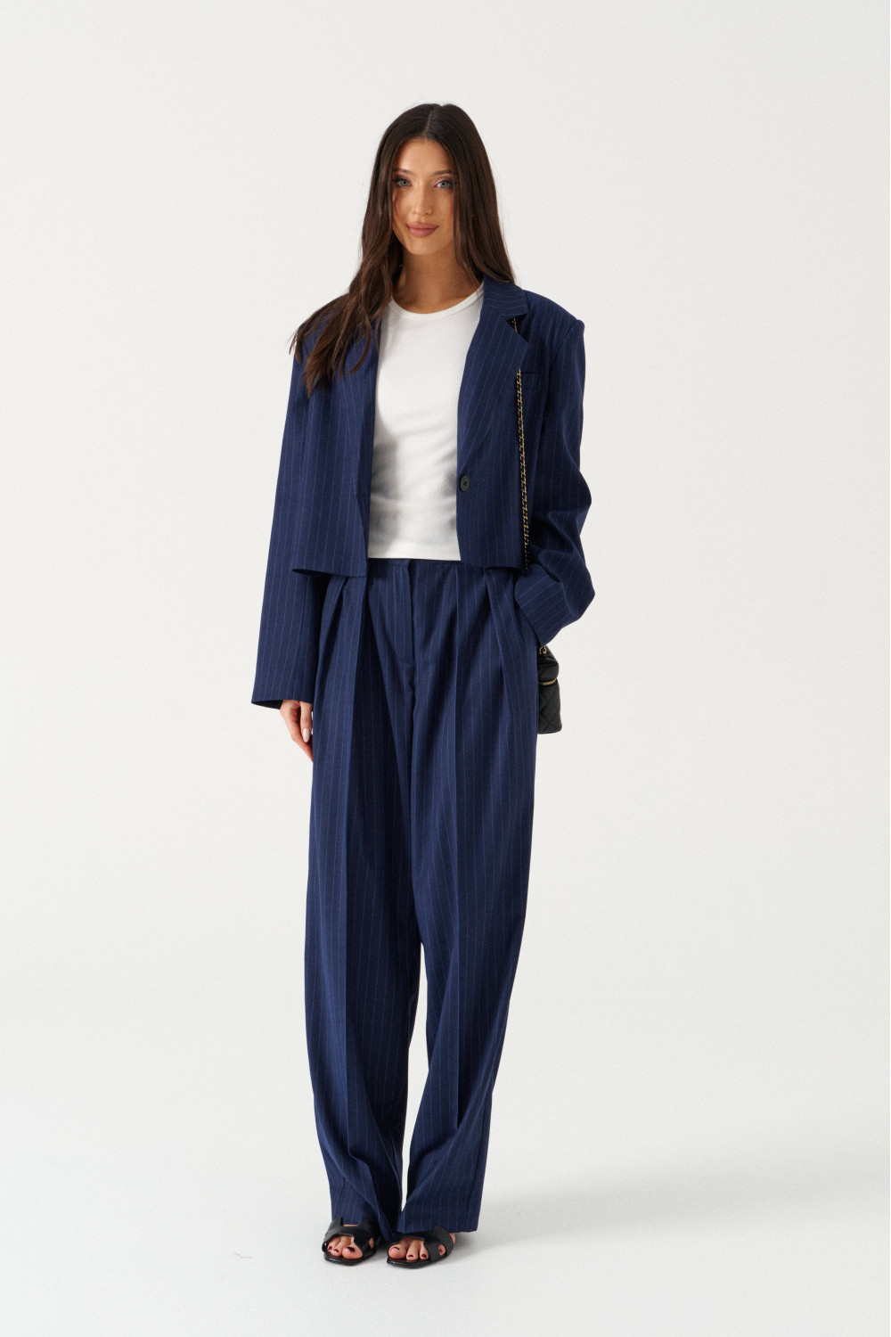 Брюки прямого свободного кроя, выполнены из костюмной ткани темно-синего цвета с более светлой синей полоской. Характеристика: свободный крой, спереди пояс планка с молнией и пуговицей, сзади пояс на резинке, спереди есть защипы, без подкладки, в боковых швах карманы.