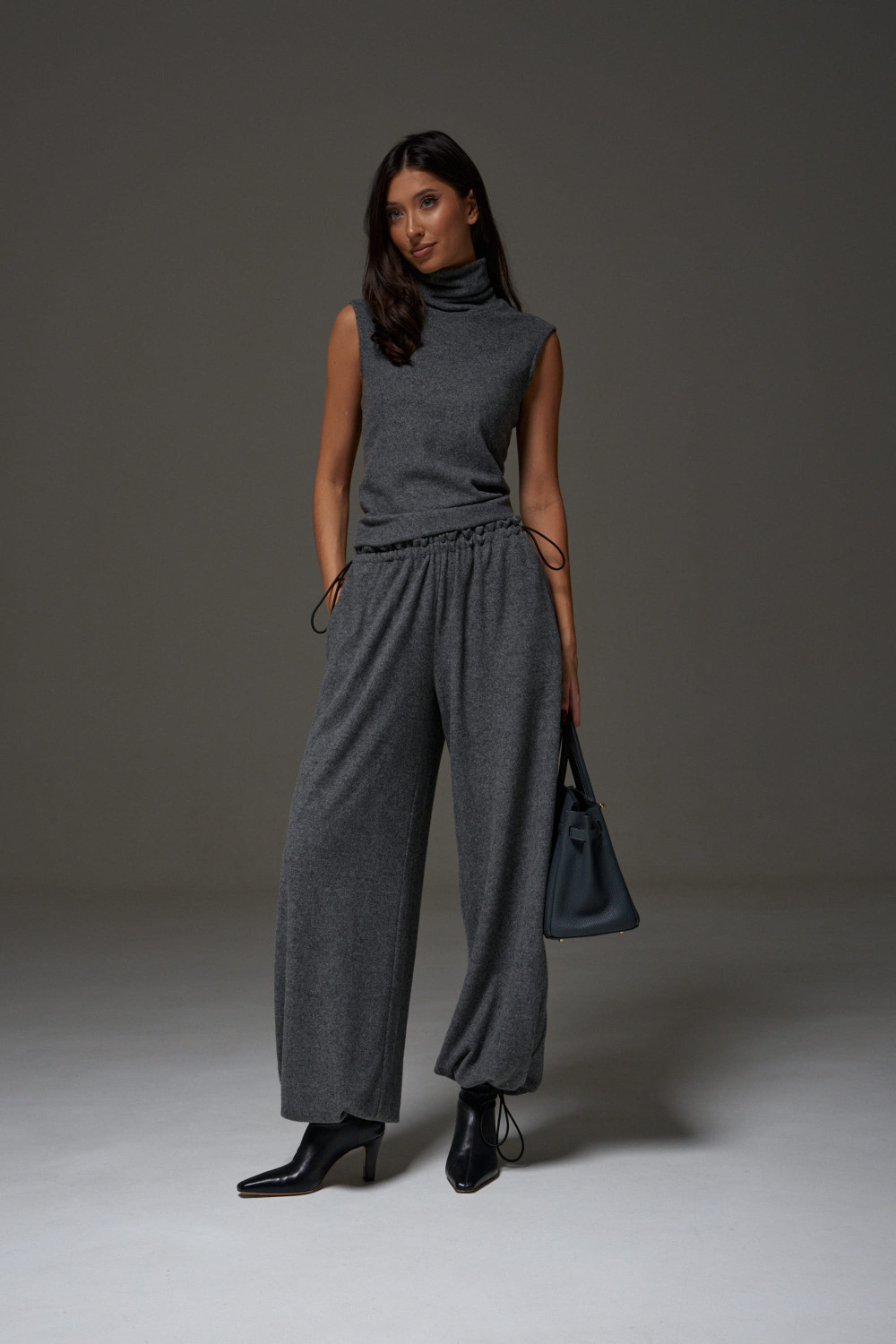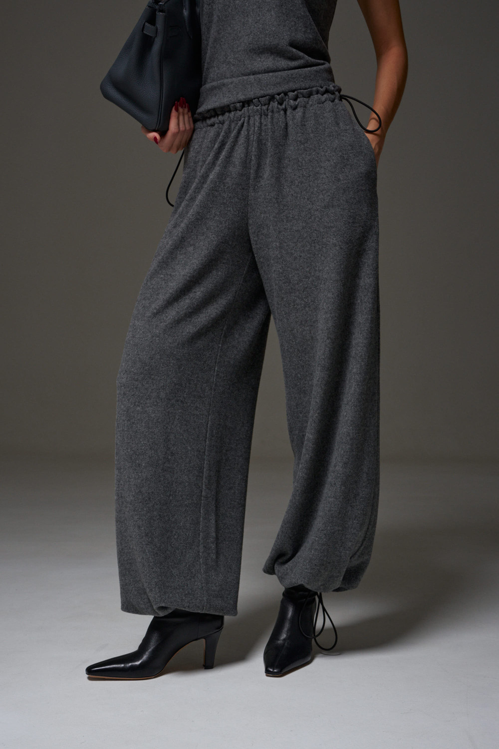 Брюки-джоггеры. Выполнены из мягкого ворсистого трикотажного полотна серого цвета. Характеристики: прямой крой, пояс на шнурке-резинке с фиксатором, в боковых швах карманы, штанина внизу на резинке с фиксатором.