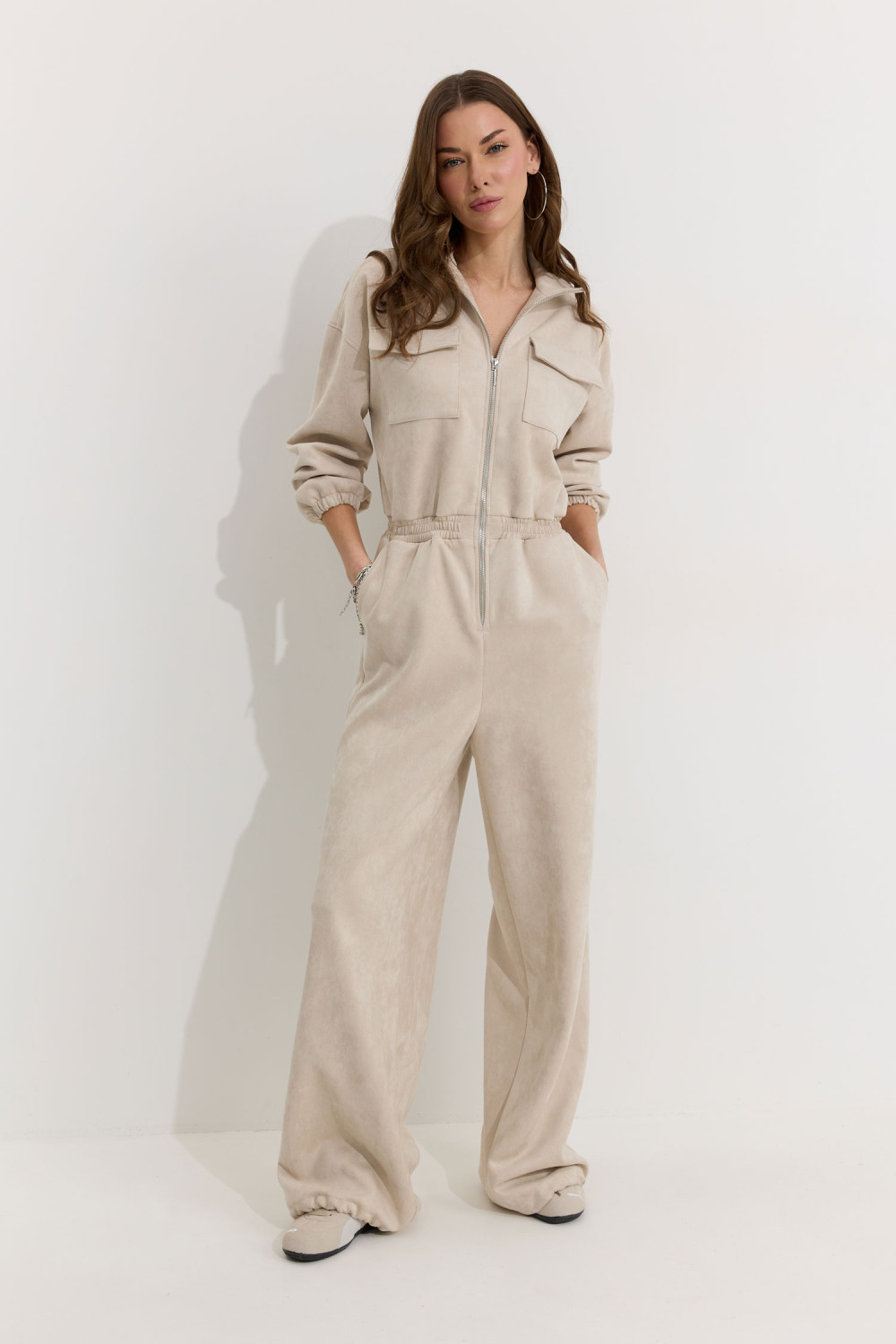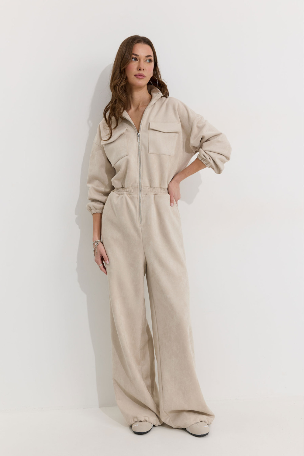 Комбинезон полуприлегающего силуэта с расширенными книзу брюками из трикотажного полотна “замша”. Горловина-стойка, по центру застежка на молнию. Рукав со спущенной линией плеча, по низу эластичная тесьма(резинка). По переду и спинке в районе талии притачной пояс, в пояс вставлена эластичная тесьма(резинка). По переду накладные карманы с клапанами. Брюки прямого силуэта, по переду и спинке карманы. По низу брюк предусмотрена кулиса с завязкой для регулирования степени прилегания. Обращаем ваше внимание, что фурнитура может отличаться от фото.