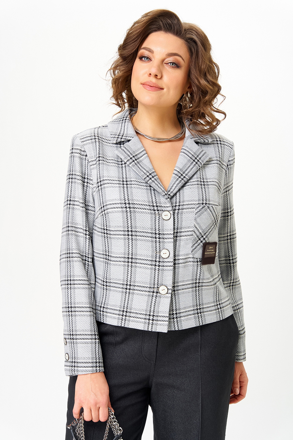 Элегантный женский жакет без подкладки с воротником пиджачного типа и застежкой на 3-и петли и пуговицы. По левой части переда накладной карман с декоративной нашивкой. Рукав втачной двухшовный со шлицей по низу и  пуговицами.