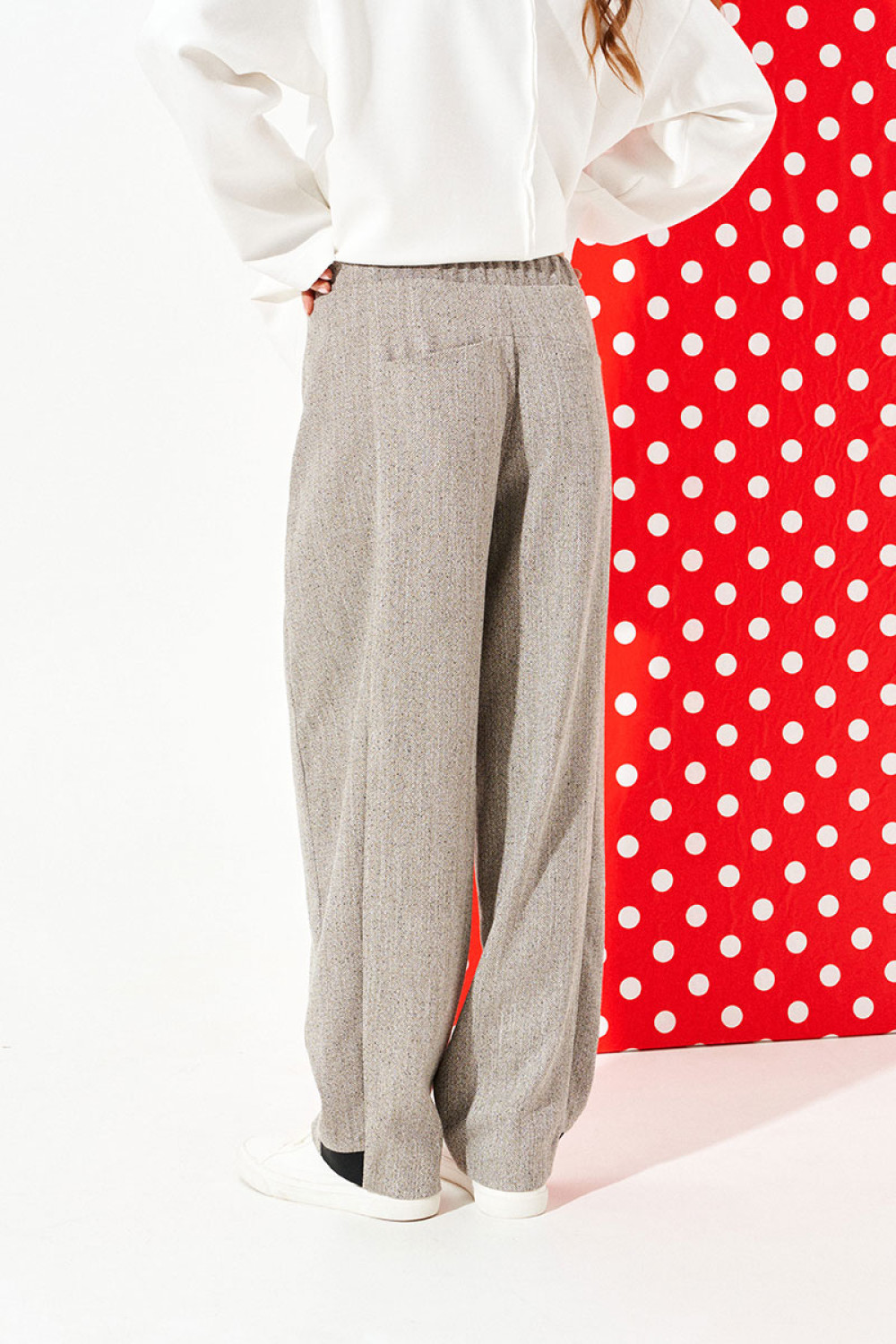 Брюки свободного объема, слегка заужены книзу. Детали переда с прорезными боковыми карманами. Брюки с отрезной боковой частью по всей длине. Нижний срез боковой детали обработан притачной деталью из полотна «кашкорсе». Детали спинки с фигурной кокеткой, в которой обработаны прорезные карманы. Пояс притачной, на резинке по спинке.