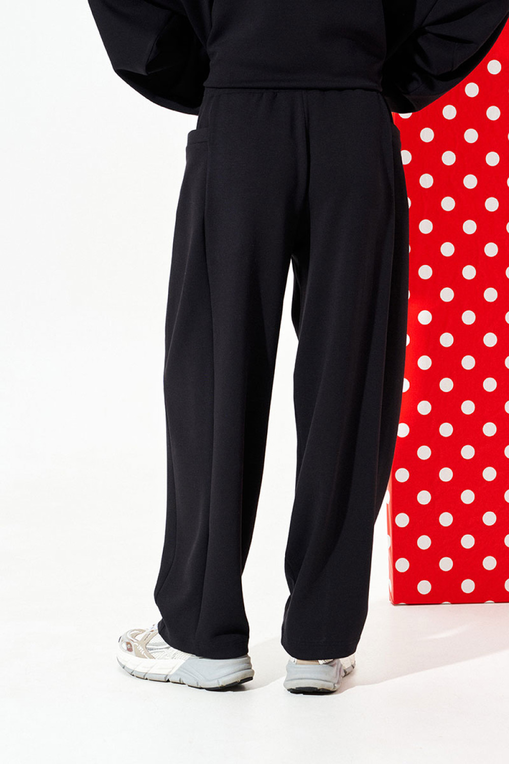 Брюки свободного объема, слегка заужены к низу. Пояс притачной, на резинке, с отделочными строчками. Брюки с отрезной боковой частью, в которой обработан карман.