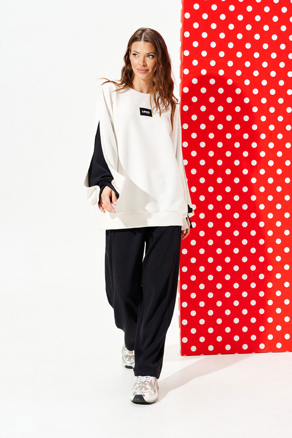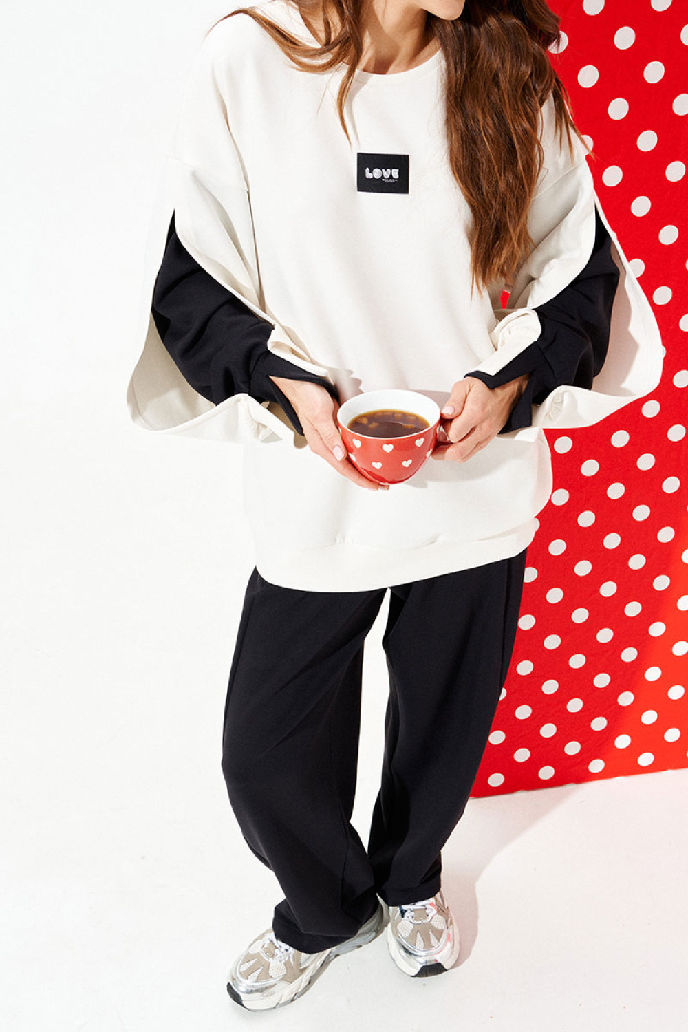 Свитшот из трикотажного полотна свободного объема, прямого силуэта, с круглым вырезом горловины. Перед и спинка цельные. Перед декорирован настрочной нашивкой. Рукав двойной, втачной, длинный. Верхний рукав с разрезом и притачной манжетой. Верхний рукав закреплен к нижнему закрепкой. Нижний рукав выполнен из контрастной ткани. Нижний рукав обработан притачной манжетой с разрезом.