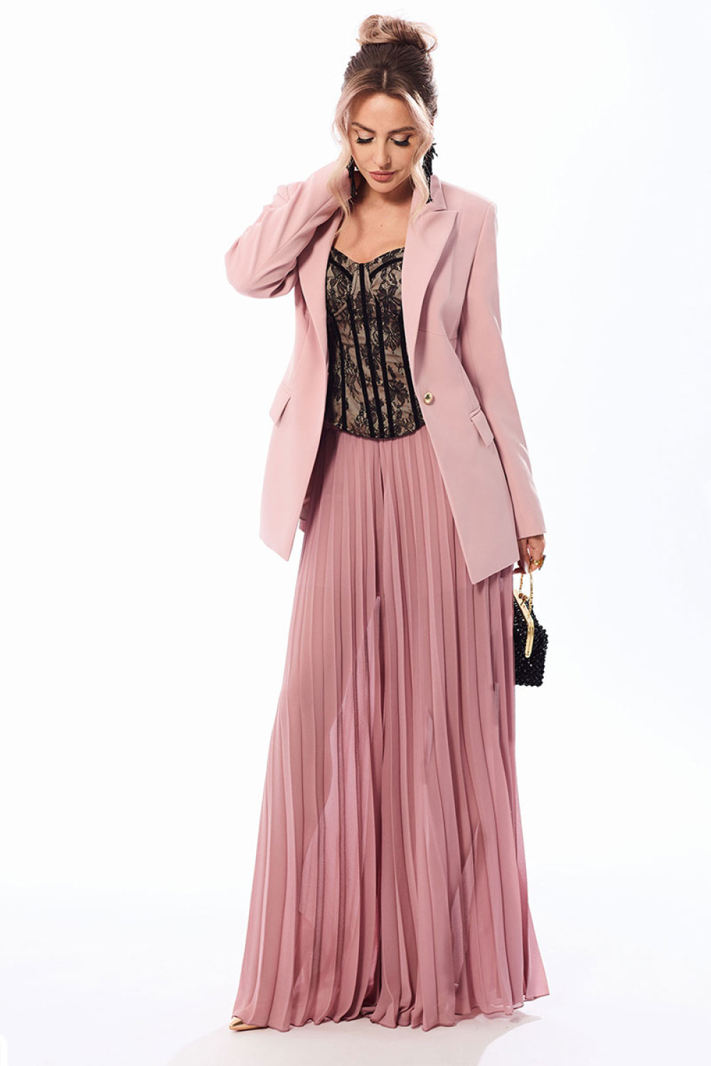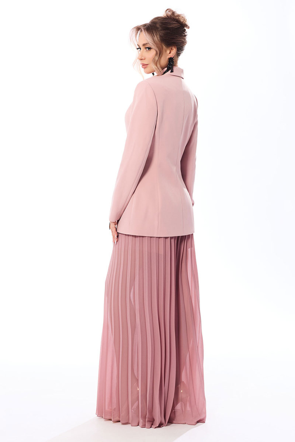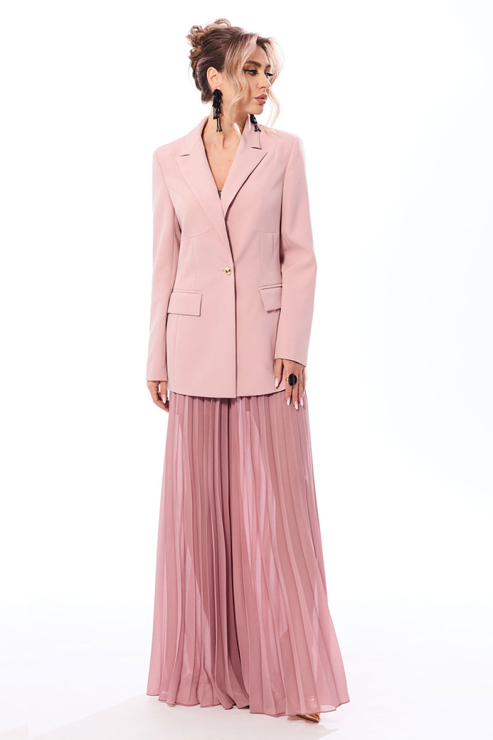 Жакет выполнен из ткани в одной цветовой гамме, брюки из шифона в тон основной ткани.