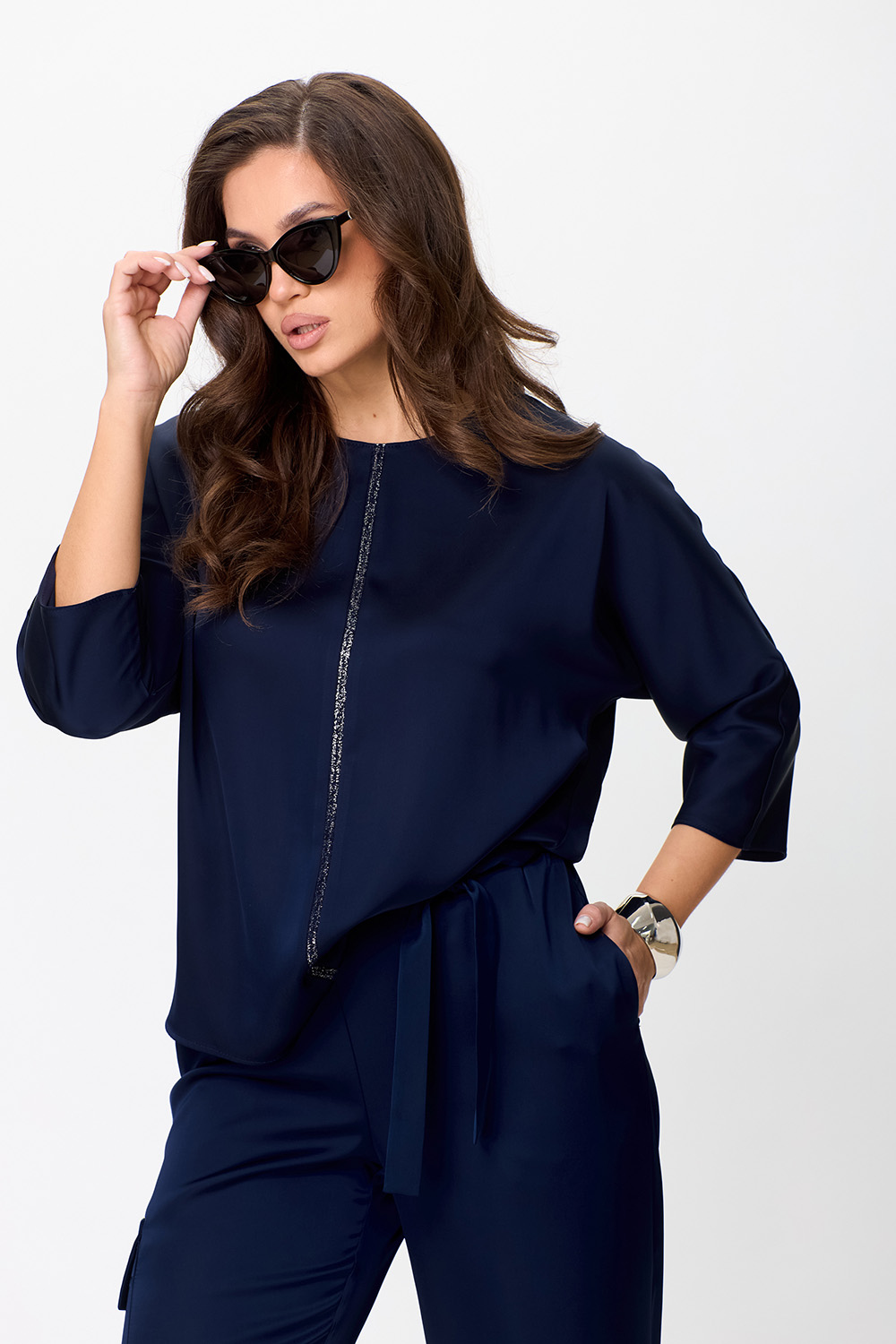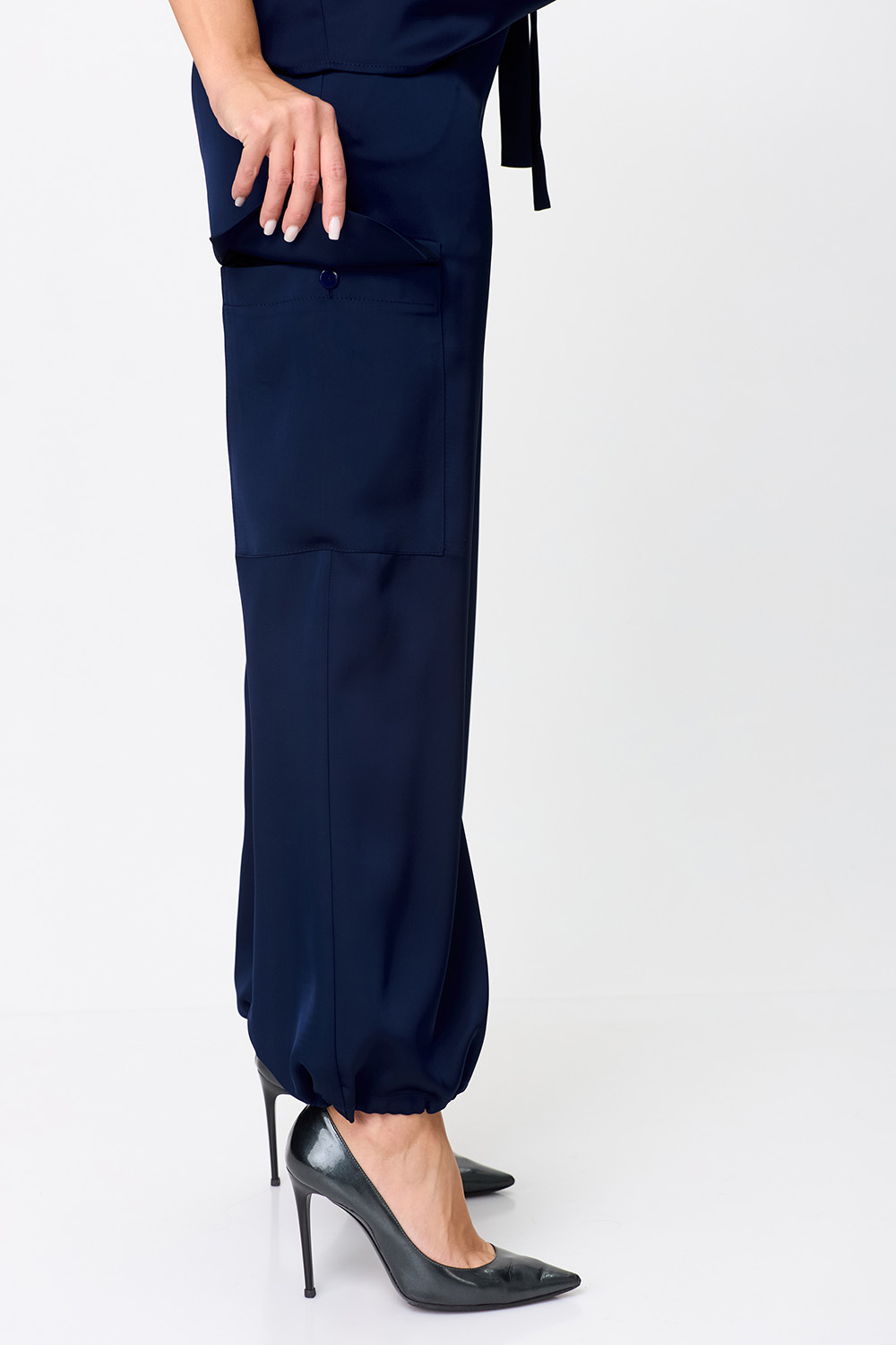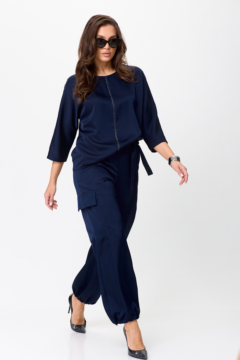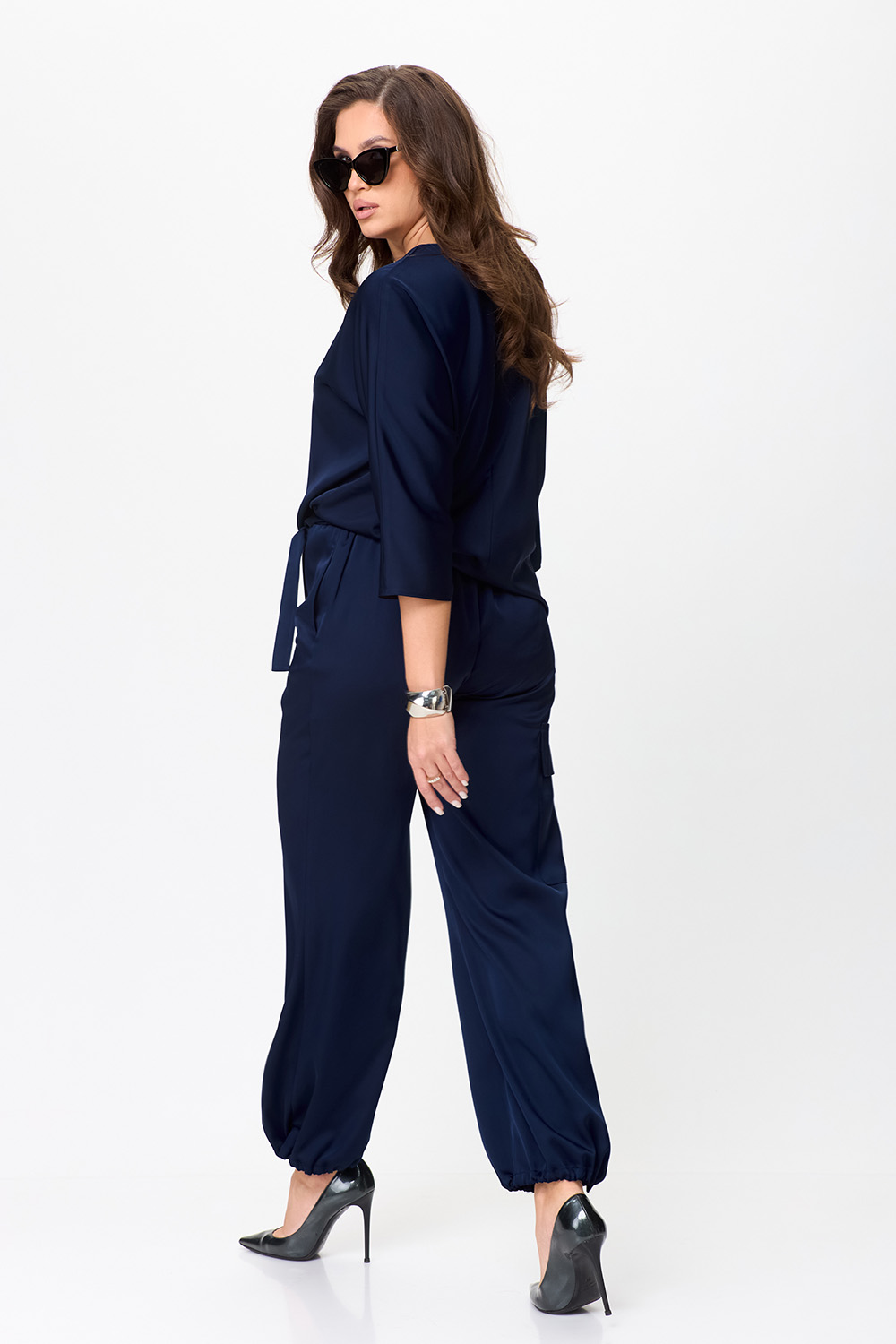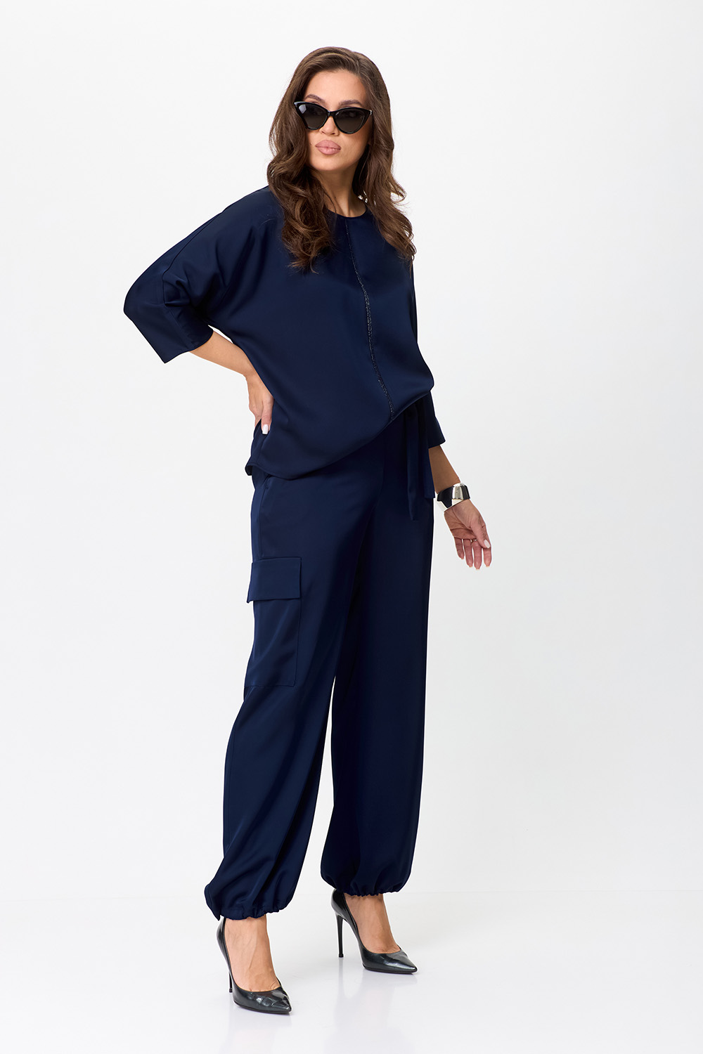 Комплект: блузон, брюки "карго". Комплект выполнен из сатина с матовым блеском. Блузон прямого силуэта. Горловина овальная. По центру переда вставлена тонкой полоской отделка. Спинка со средним швом.
