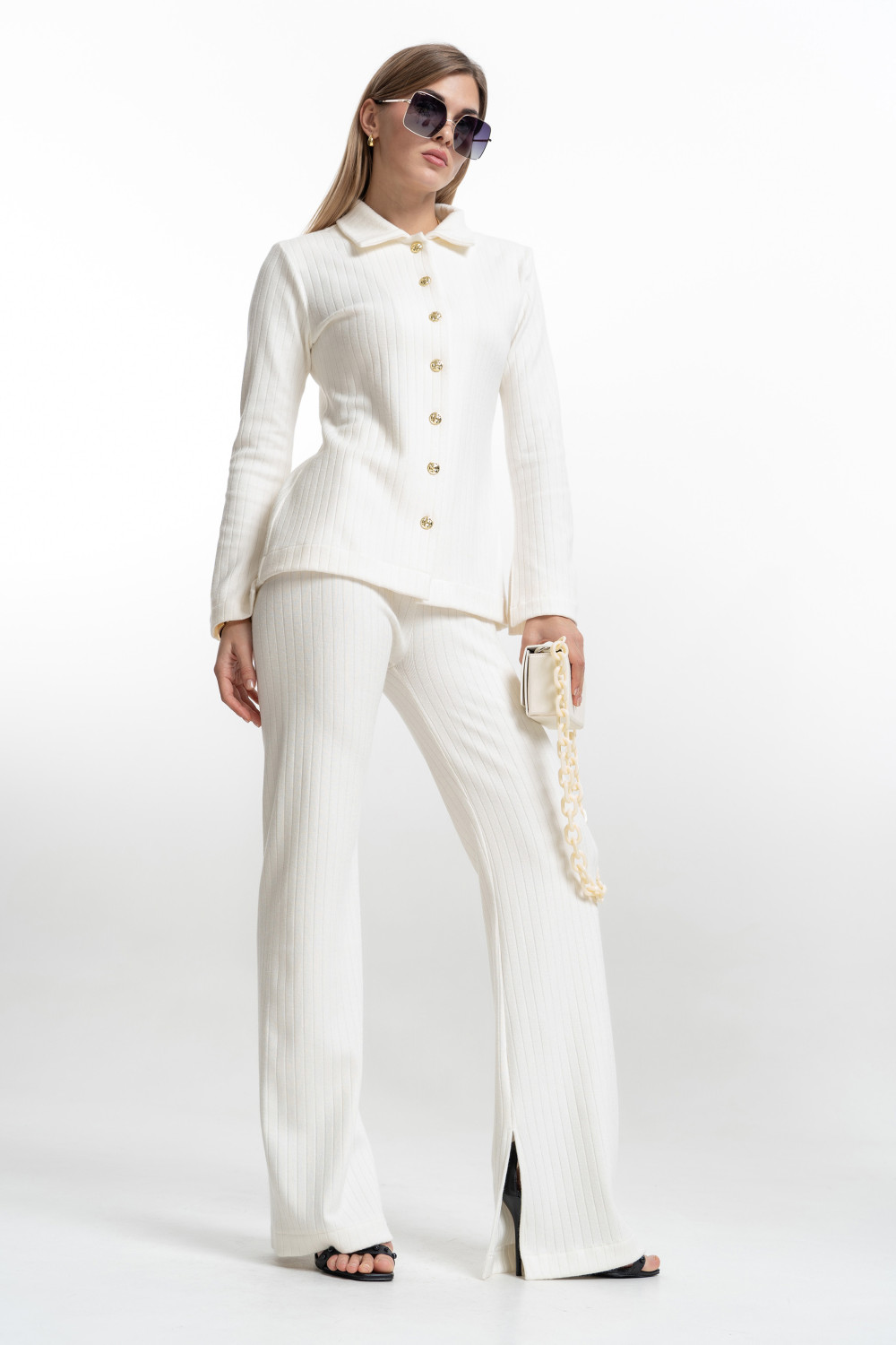 Брюки облегающего силуэта, слегка расклешенные к низу от линии колена. Без бокового шва, с разрезом во внутреннем шве. Изделие с поясом на резинке. Комплект идеально подходит как для нарядных, так и для повседневных стильных образов.