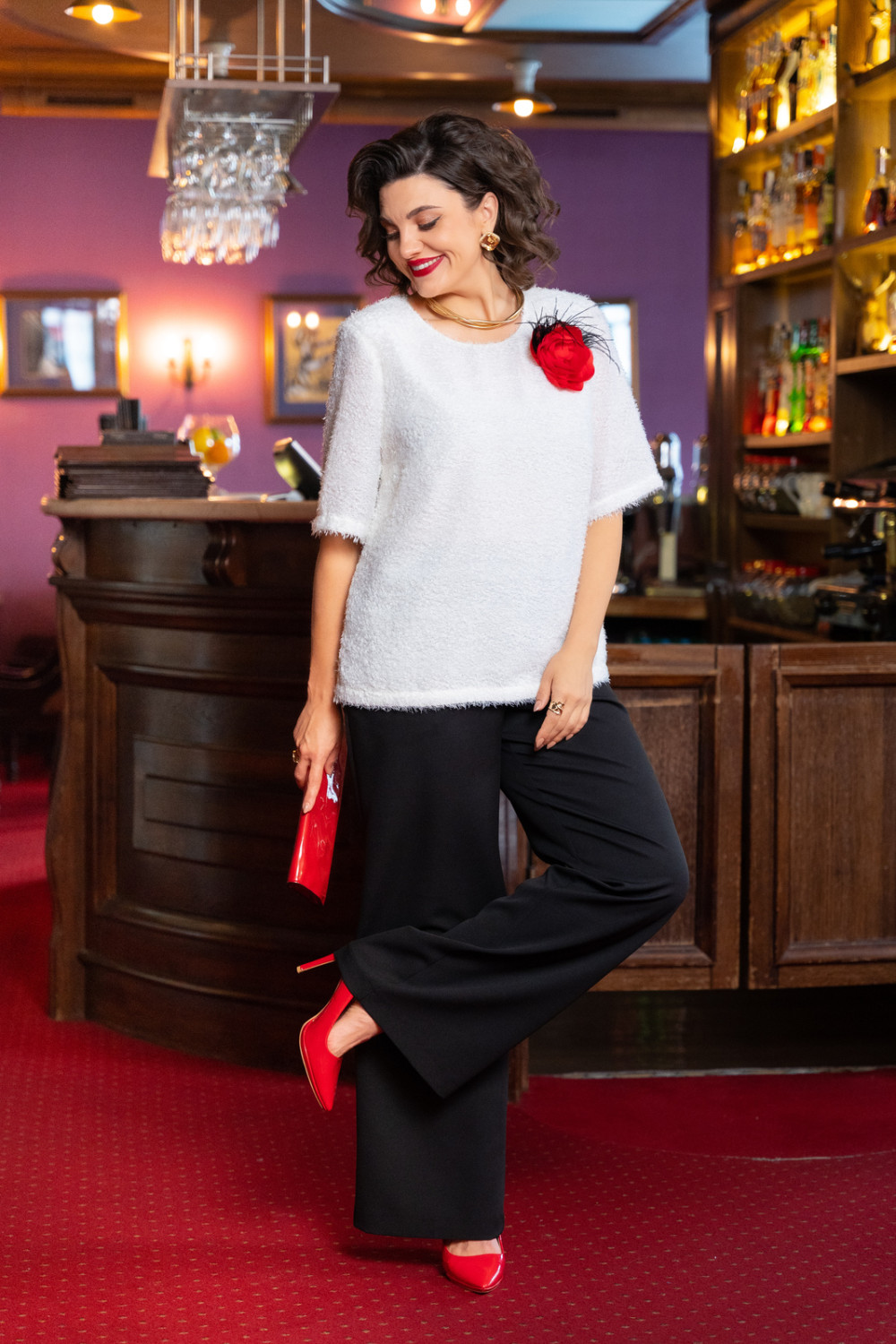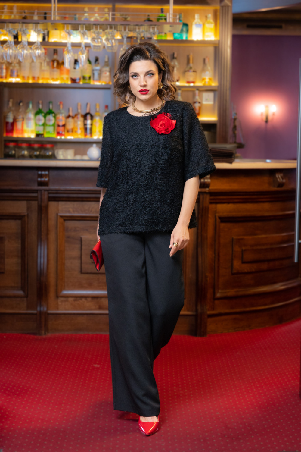 Комплект состоит из топа и брюк. Топ прямого силуэта с естественной линией плеча. По переду выполнены нагрудные вытачки. Горловина округлой формы. В горловине спинки выполнен вырез "капля" с застёжкой на навесную петлю и пуговицу. Верхний слой топа выполнен из полотна с "ресничками". Нижний слой топа - из трикотажной подкладки. Рукав длиной до линии локтя. Брюки расширенные к низу типа "палаццо" с центральной застёжкой на молнию и петлю-пуговицу. В боковых швах карманы с отрезным бочком. Пояс притачной с резинкой по задней части пояса. В комплект входит съёмный цветок с перьями контрастного цвета.