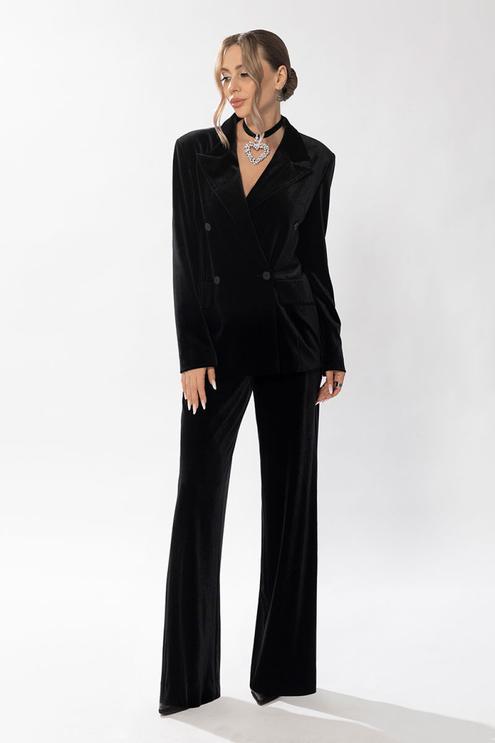 Костюм. Жакет прямого силуэта с центральной двубортной застежкой на петли и пуговицы, с втачным воротником и отложными лацканами пиджачного типа. По переду с рельефами, выходящими из проймы. На уровне линии талии расположены настрочные клапаны. Спинка со средним швом, рельефами, выходящими из проймы. Рукав втачной, длинный. Брюки прямые, с отрезным поясом. По спинке и частично по переду пояс присборен на резинку.