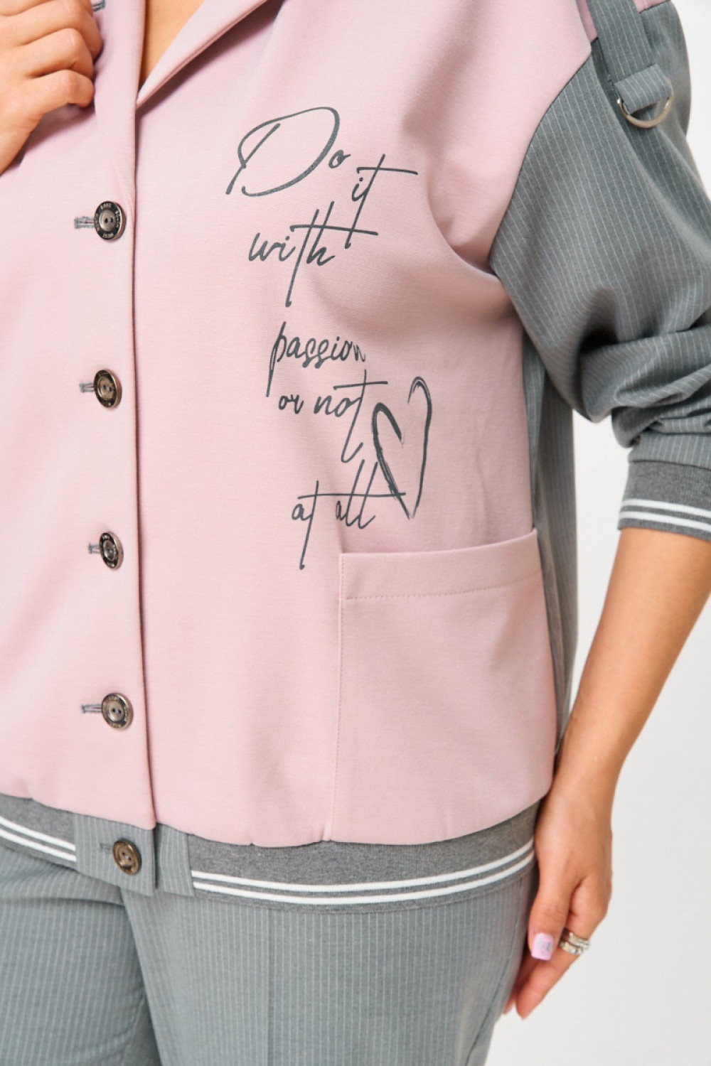 Жакет со спущеным плечем и декорирован печатью по левой части переда, воротник пиджачного типа. По пинии плеча паты с полукольцом. Рукав втачной одношовный с манжетой по низу. Спинка с кокеткой и отлетной планкой. Понизу довяз и регулируемая кулиса.