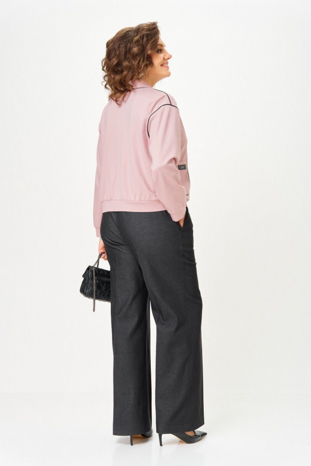 Костюм выделяется нежным оттенком кардигана, который контрастирует с джинсами графитового цвета брюк, создавая баланс между мягкостью и строгостью. Дизайн вдохновлен минималистичным стилем с акцентом на контрастные швы и аккуратные детали, такие как нашивка и пуговицы. Кардиган свободного кроя с глубоким V-образным вырезом и застежкой на крупные декоративные пуговицы. Контрастная отделка кантом по краям и по швам. Два накладные кармана спереди и контрастная нашивка на кармане для акцента придают образу лёгкости и расслабленности. Длинные рукава с эластичными манжетами обеспечивают удобную посадку. Рукав на спущенной пройме.