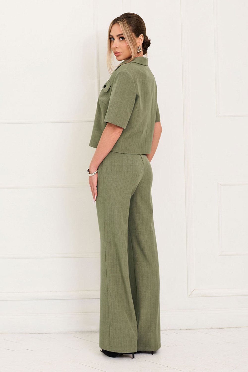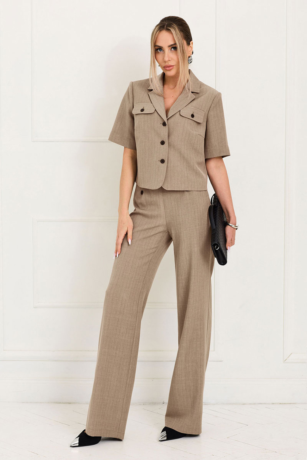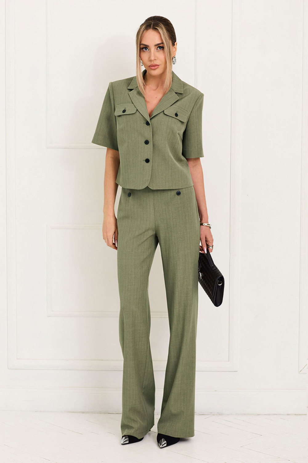 Жакет с центральной застежкой на петли и пуговицы с втачным воротником и отложными лацканами. По переду с нагрудными вытачками и настрочными клапанами, расположенными на уровне линии груди. Спинка со средним швом. Линия низа фигурная. Рукав втачной, короткий. Жакет на подкладке.