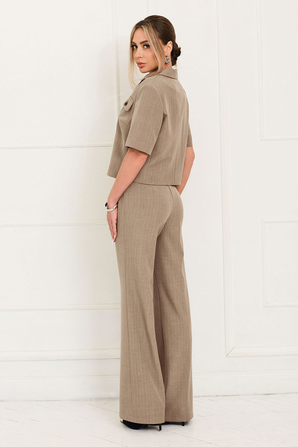 Брюки без пояса, верхний срез обработан обтачками. Застежка на потайную молнию в левом боковом шве. По вытачкам передних половинок пришиты отделочные пуговицы. Силуэт: полуприлегающий.