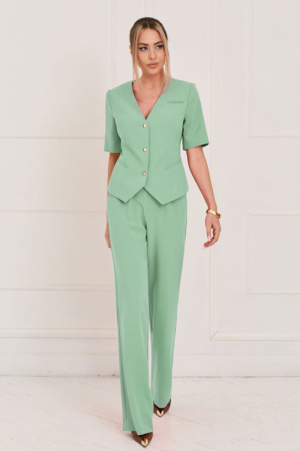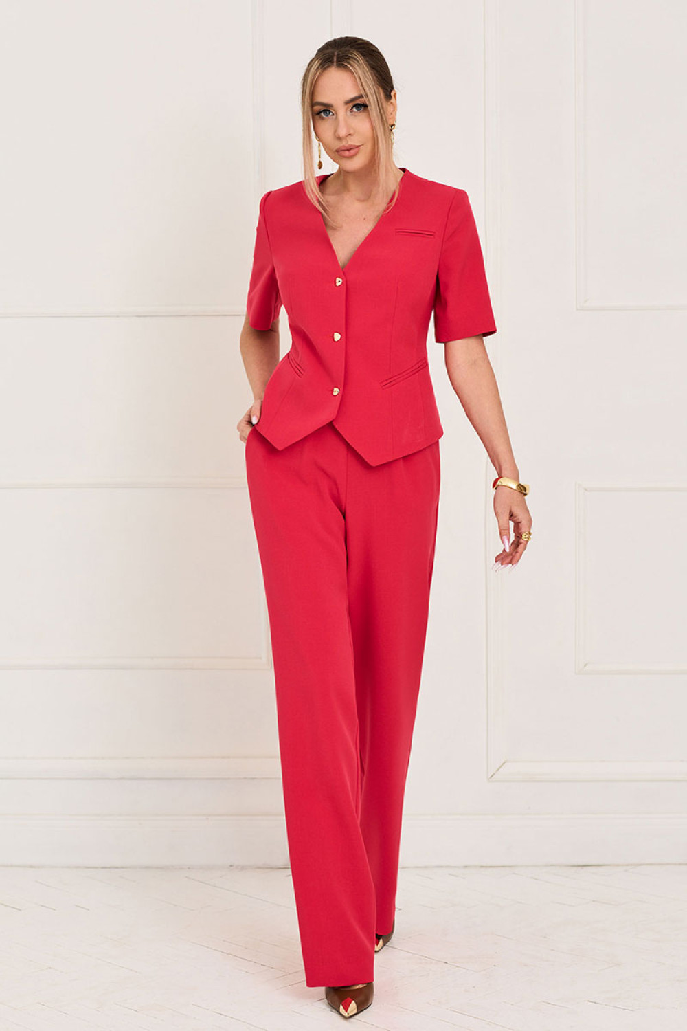 Жакет с центральной застежкой на петли и пуговицы, без воротника, с V-образным вырезом горловины. По переду с талиевыми вытачками и рельефами, выходящими из проймы, прорезными карманами в рамку, расположенными на уровне линии талии. Спинка со средним швом, рельефами, выходящими из проймы. Рукав втачной, короткий. Комплектация: жакет на подкладке.