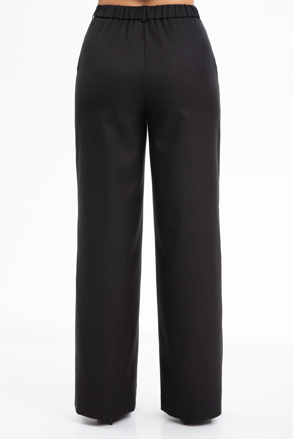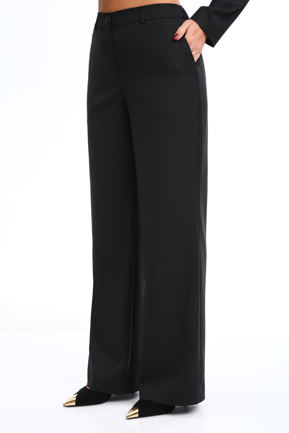 Брюки с отрезным поясом, на поясе расположены шлевки. В боковых швах расположены карманы. Вход в карман наклонный к боковому шву. Застежка гульфик. Пояс в области спинки присборен на резинку. Костюм со съемным декоративным поясом. Декоративный пояс из кож зама, декорирован бахромой.