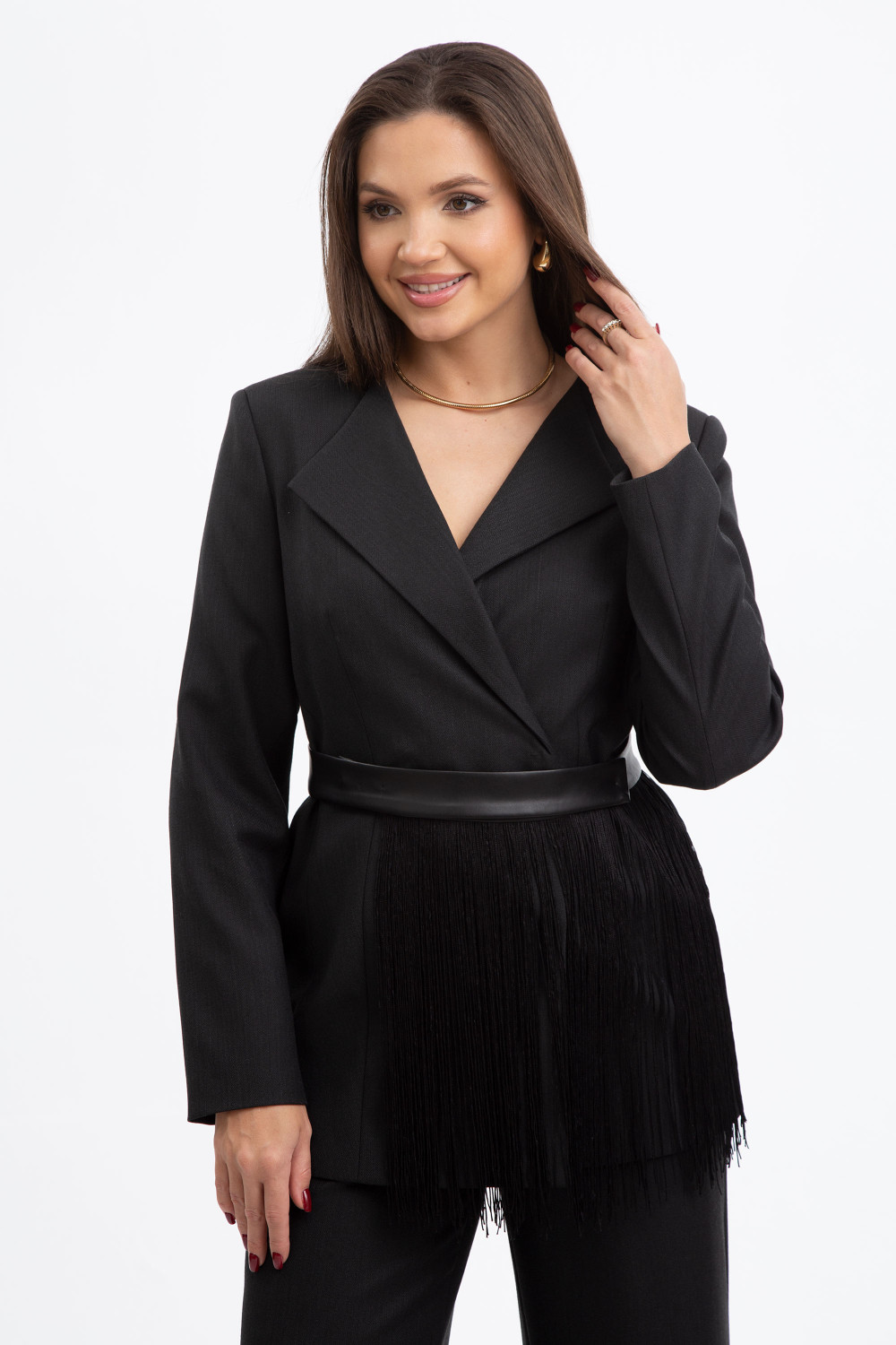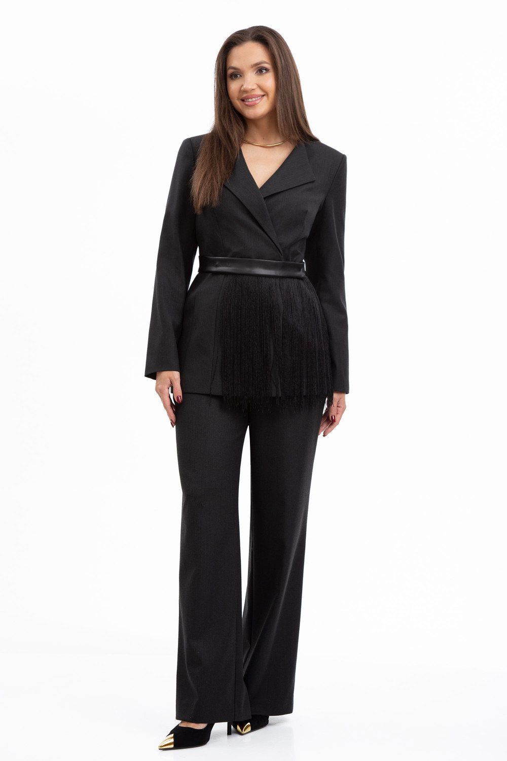 Жакет с центральной двубортной застежкой на пришивные кнопки, без воротника с отложными лацканами. По переду с рельефами, выходящими из проймы, талиевыми вытачками. Спинка со средним швом, рельефами, выходящими из проймы, талиевыми вытачками. Рукав втачной, длинный. Силуэт: полуприлегающий.