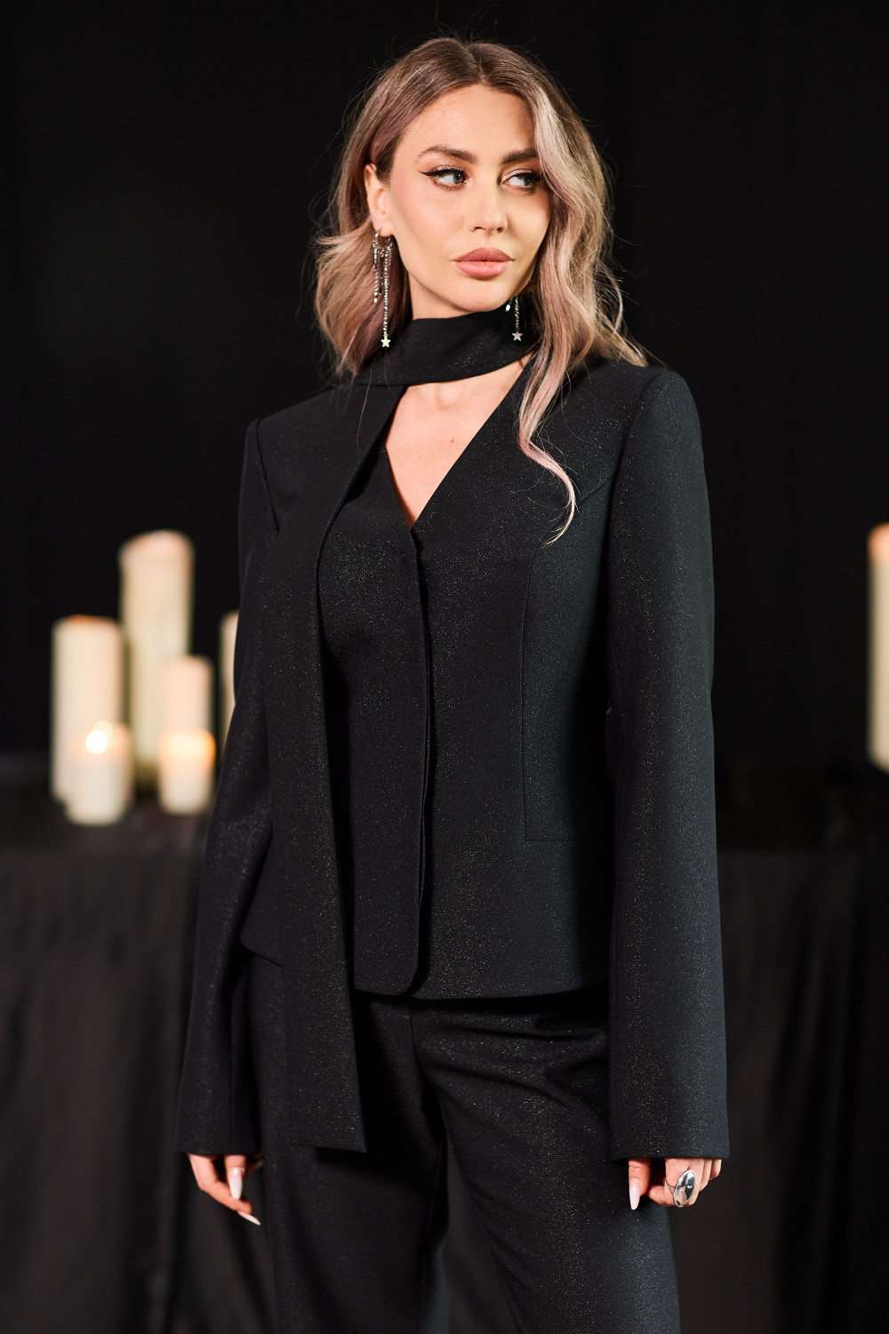 Жакет с центральной потайной застежкой на петли и пуговицы, без воротника, с V-образным вырезом горловины. По переду с рельефами, выходящими из проймы и входящими в боковой шов. По спинке с рельефами, выходящими из проймы. По н6изу спинки- баска. Рукав втачной, длинный. Силуэт: полуприлегающий.