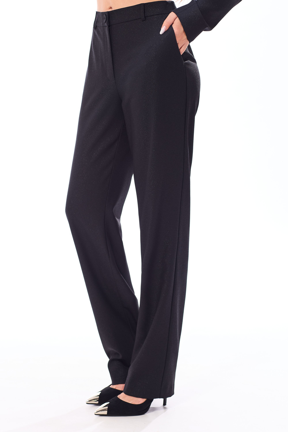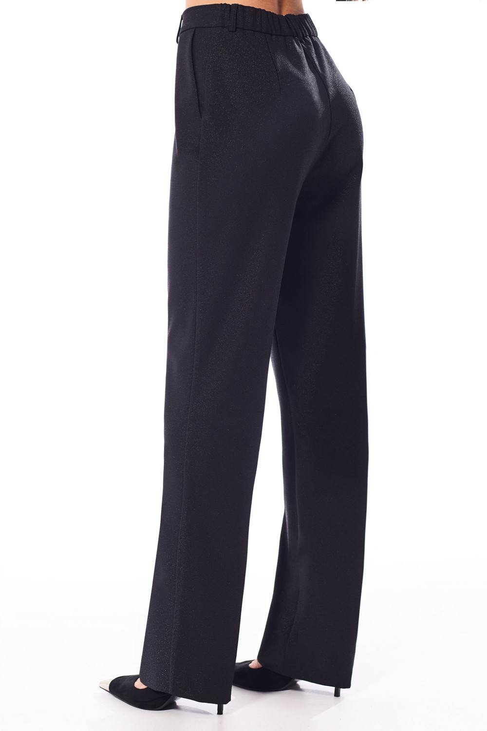 Брюки-с отрезым поясом, на поясе расположены шлевки. В области спинки пояс присборен на резинку. Застежка гульфик. Передние половинки с карманами. Вход в карман наклонный к боковому шву.