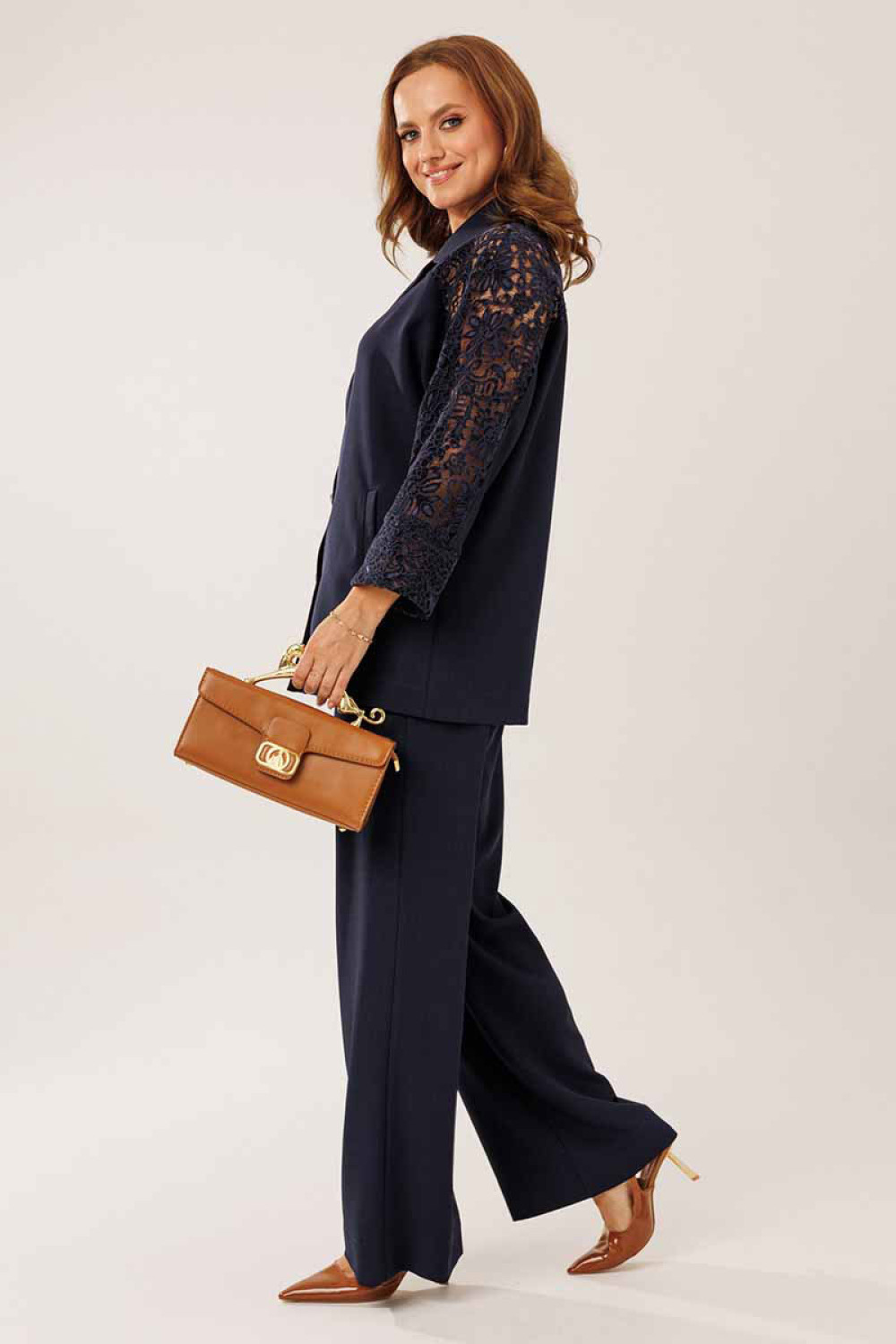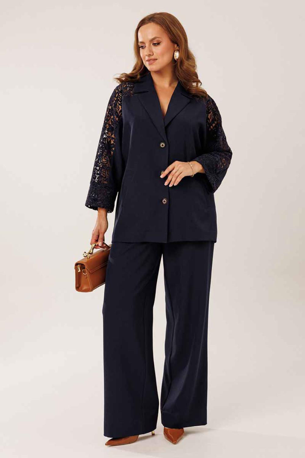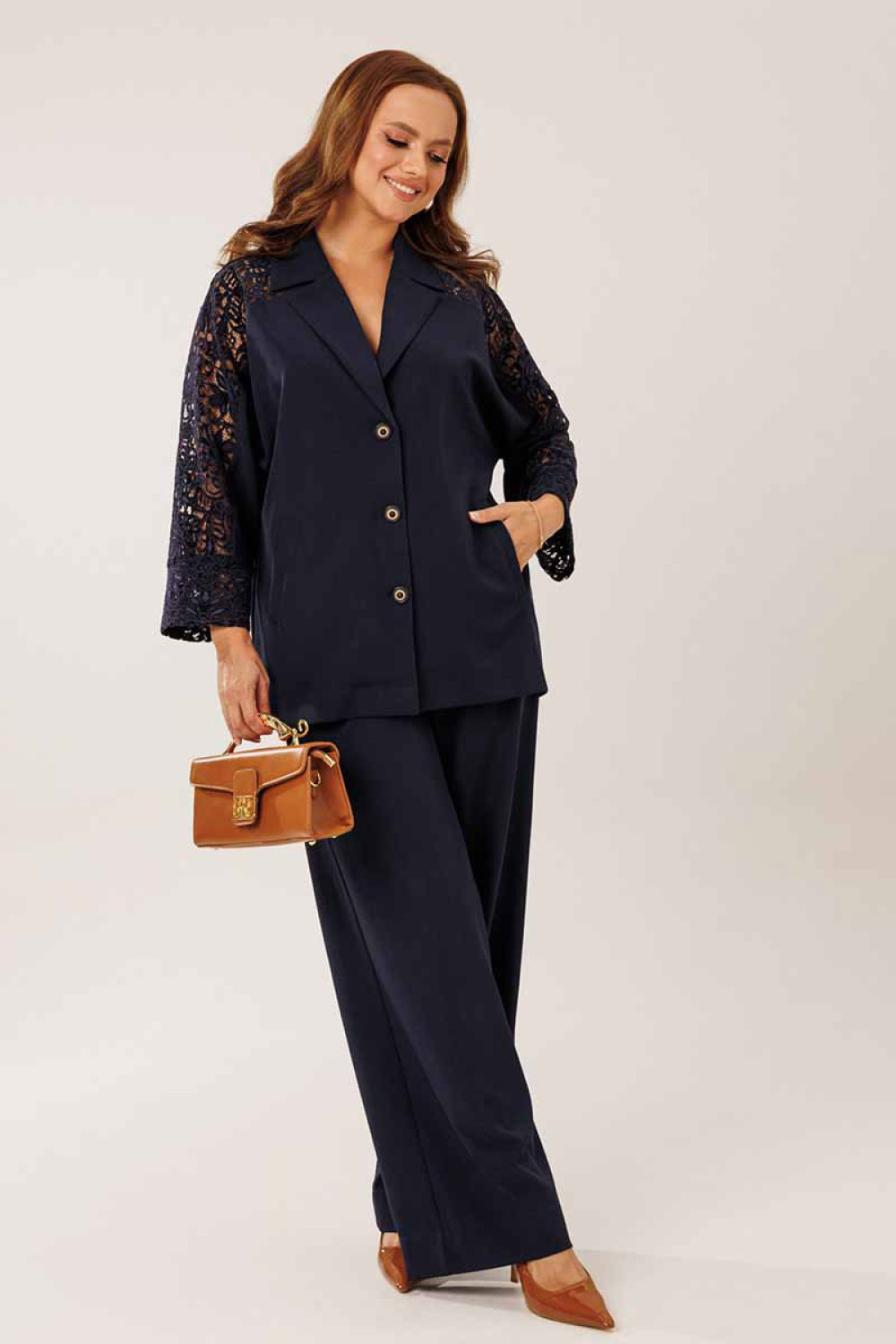 Жакет однобортный без подкладки, прямого силуэта с цельнокроеными рукавами. На полочках жакета обработаны наклонные прирезные карманы «в рамку» с листочкой. Кокетка полочки переходящая в кокетку спинки и верхнюю часть рукава из набивного гипюра в цвет основной ткани жакета. Манжета рукава так же из набивного гипюра. Спинка жакета прямая. Застежка на декоративные петли пуговицы. Горловина обработана втачным воротником с отрезной стойкой и лацканами.
