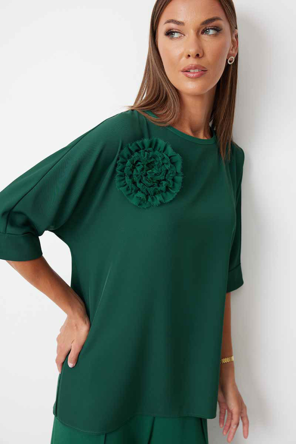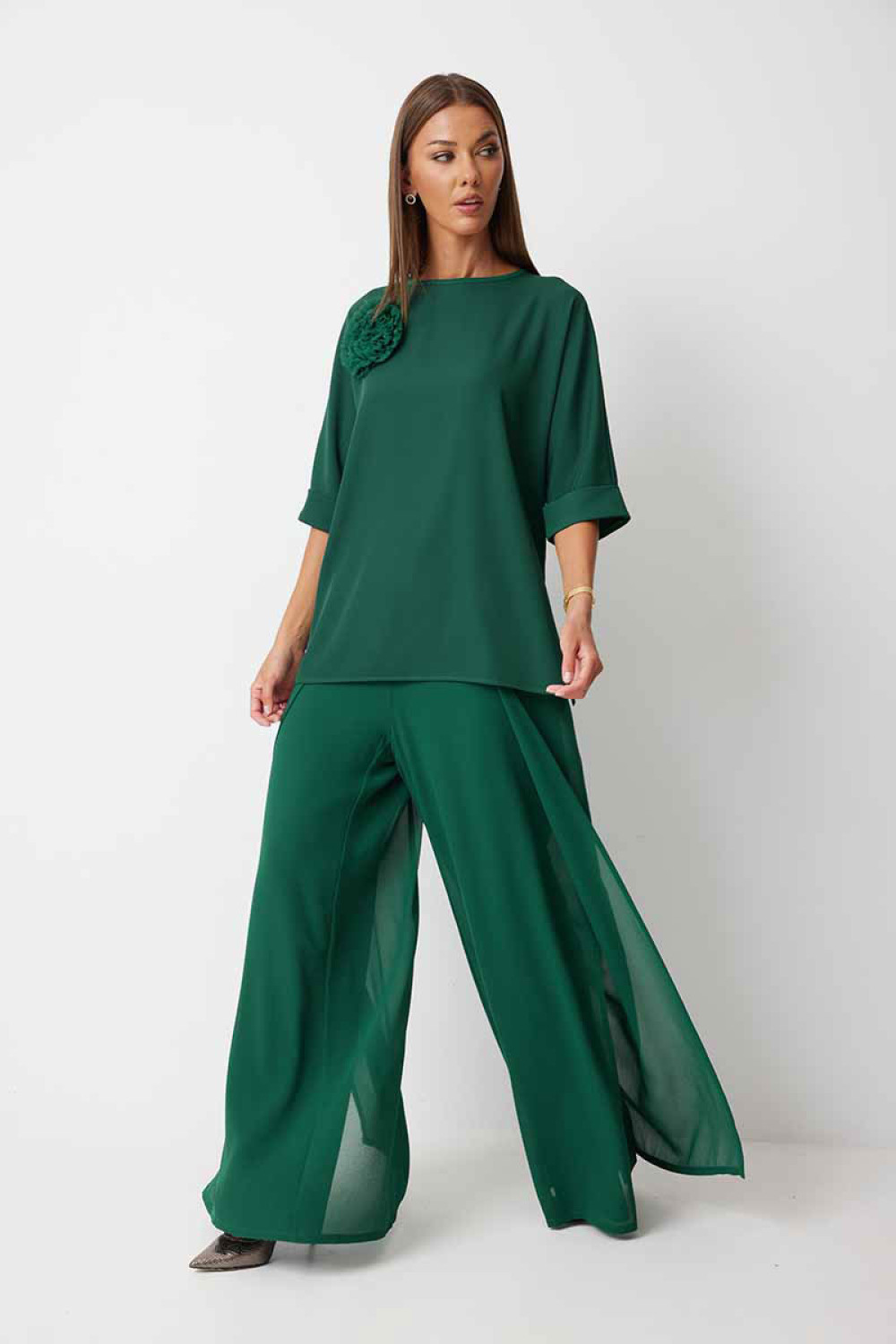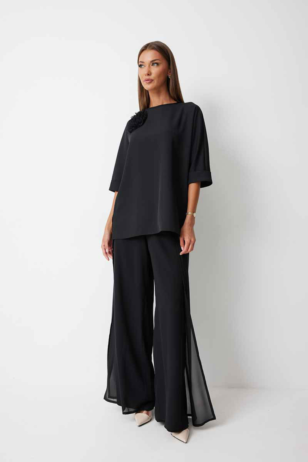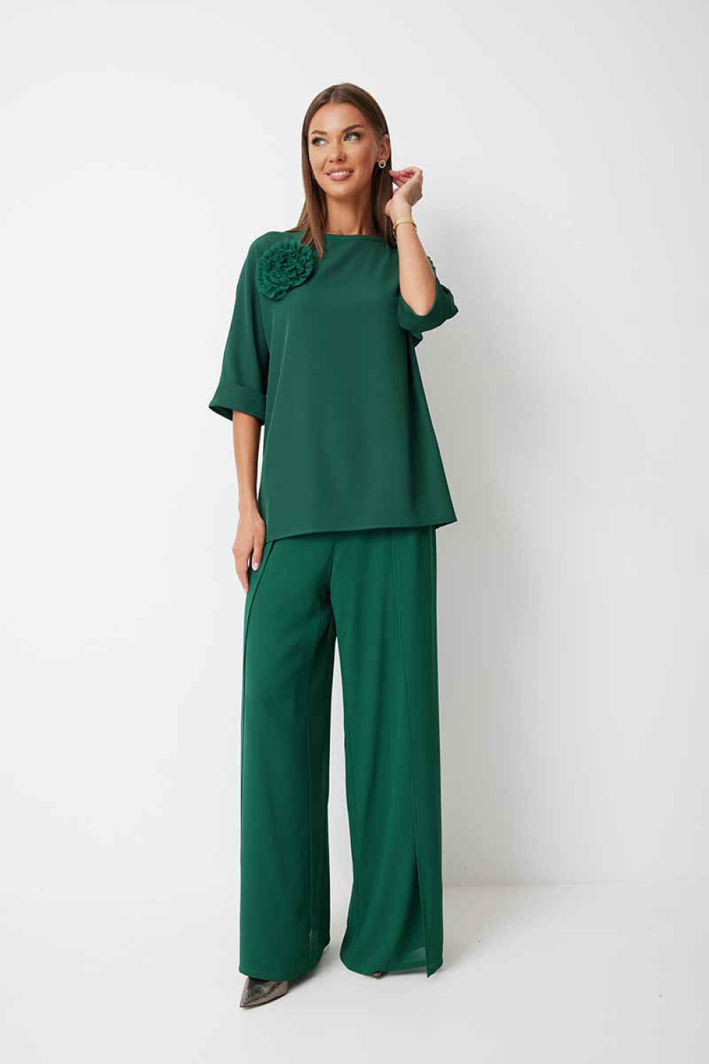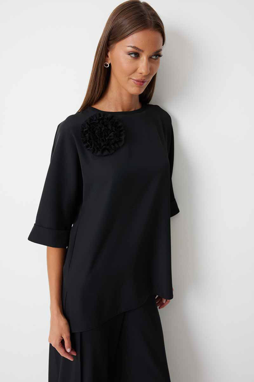 Блуза женская прямого силуэта закрывающая линию паха с цельнокроеными рукавами. К блузке прилагается съёмный декор – цветок. По боковым швам располагаются разрезы. Спинка с центральным швом и застежкой на навесную петлю и пуговицу. Горловина обработана косой бейкой. Рукав до локтя, низ рукава обработан отрезной отворачивающейся манжетой, закрепленной по швам. Низ блузки обработан швом «в подгибку».