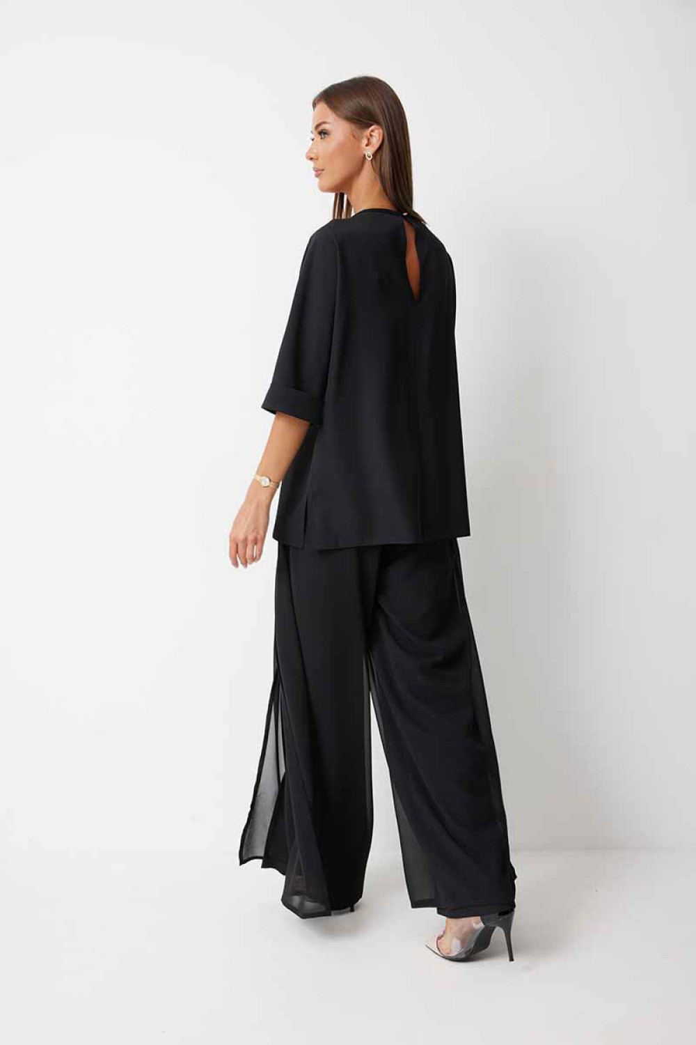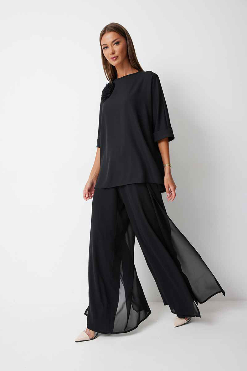 Брюки прямого силуэта, выполнены из шифоновой ткани на подкладке полной длинны. Боковой шов брюк открыт. Синка брюк заходит на перед по верхней части. Подкладка из не просвещающейся креповой ткани. Верх брюк обработан отрезным поясом. Центральная часть пояса без резинки, остальной пояс на резинке. Низ брюк обработан швом « в подгибку».
