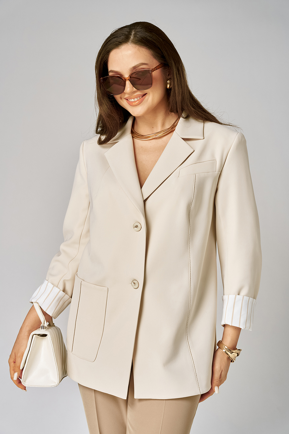 Жакет прямой, полностью на подкладке. По переду выполнен 1 накладной карман с защипом с контрастной отстрочкой. Отделка в виде вертикального шва с контрастной отстрочкой и декоративной листочкой в верхней части переда. Воротник пиджачный. Нагрудная выточка спрятана под воротник. Застёжка центральная на 2 петли и пуговицы. Рукав втачной двушовный. Низ рукава выполнен с контрастной отделкой, может отворачиваться как манжет.