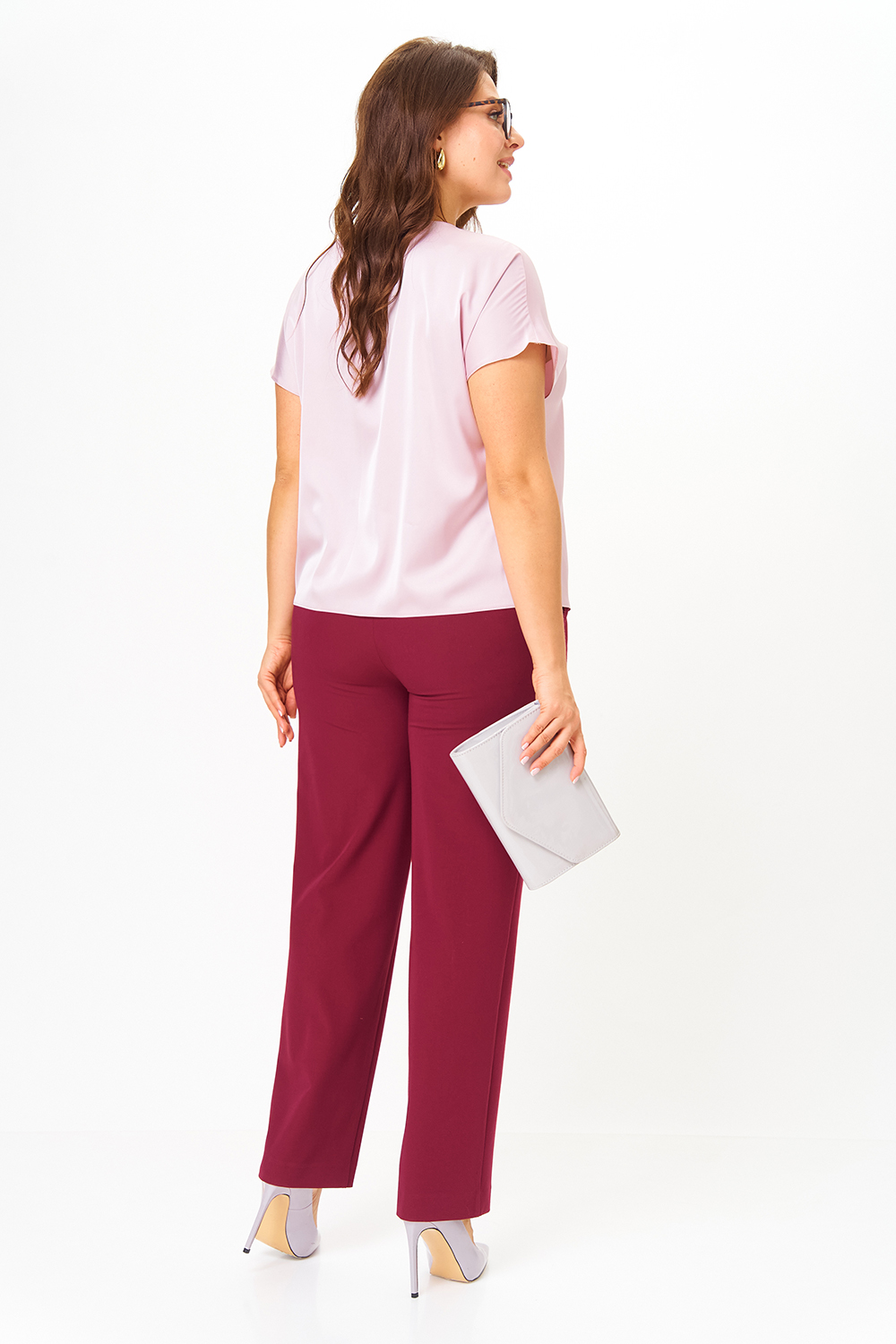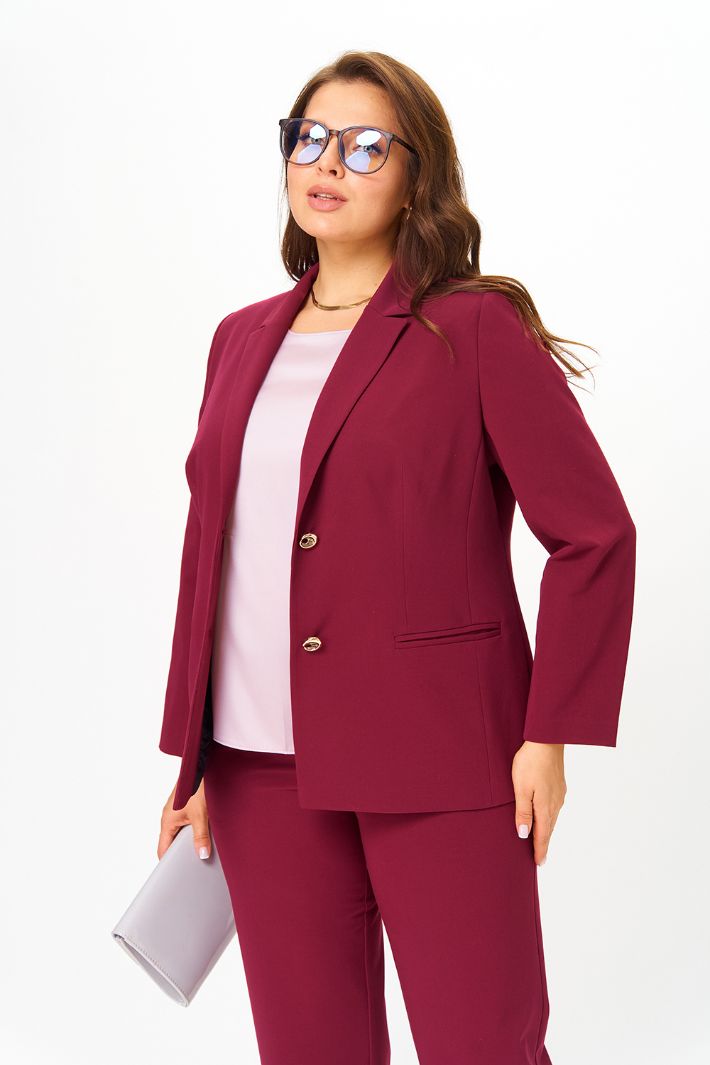 Костюм тройка, состоящий из жакета, топа и брюк. Жакет однобортный на подкладке с застежкой на петли-пуговицы. Рукав втачной двухшовный. По переду обработаны прорезные карманы в рамку. Брюки прямые на притачном поясе с застежкой на молнию и крючок, и карманами в боковых швах.