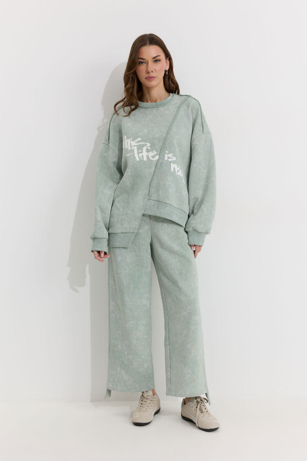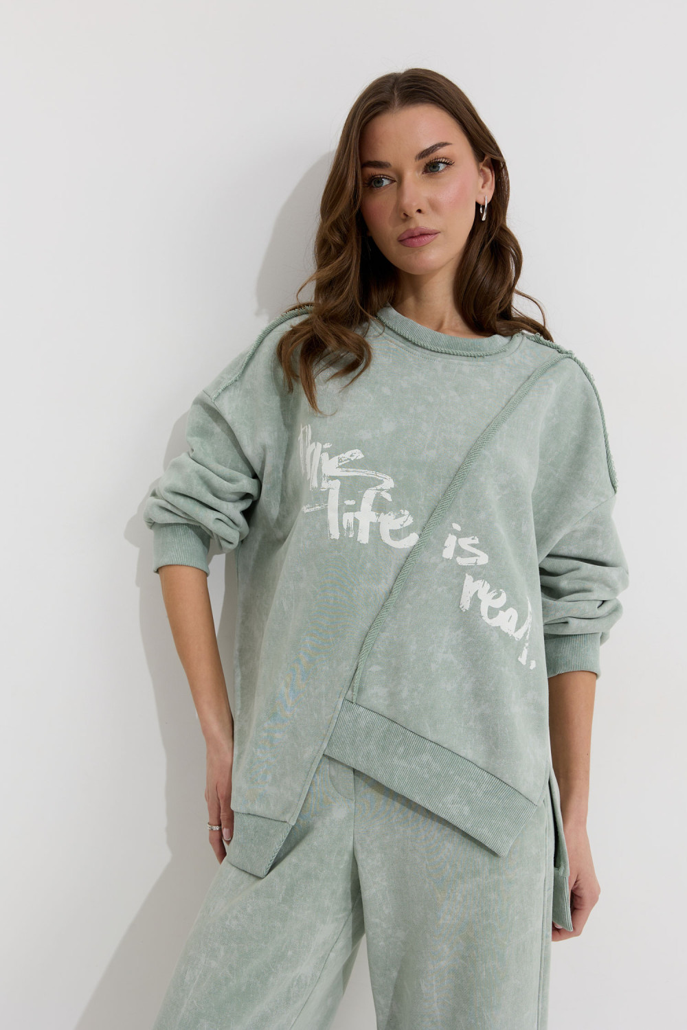 Ассиметричный джемпер прямого силуэта из трикотажного полотна. Горловина округлая. Рукав со спущенной линией плеча . По переду и спинке декоративный шов, по низу пояс с нашивкой. По низу джемпера и рукава декоративная сетка.
