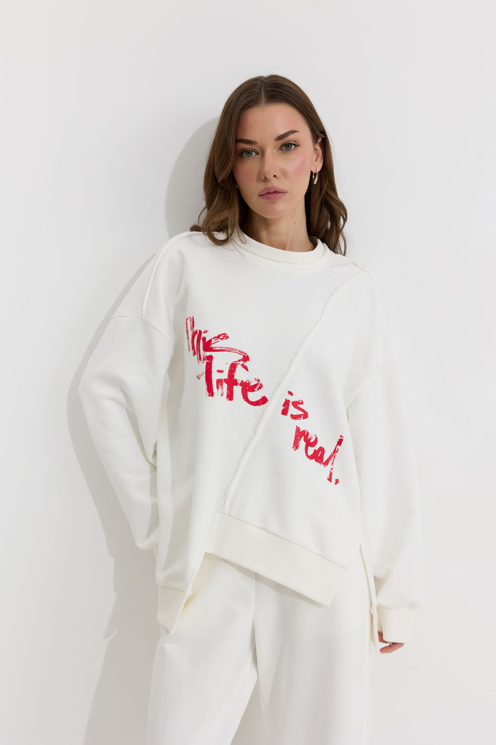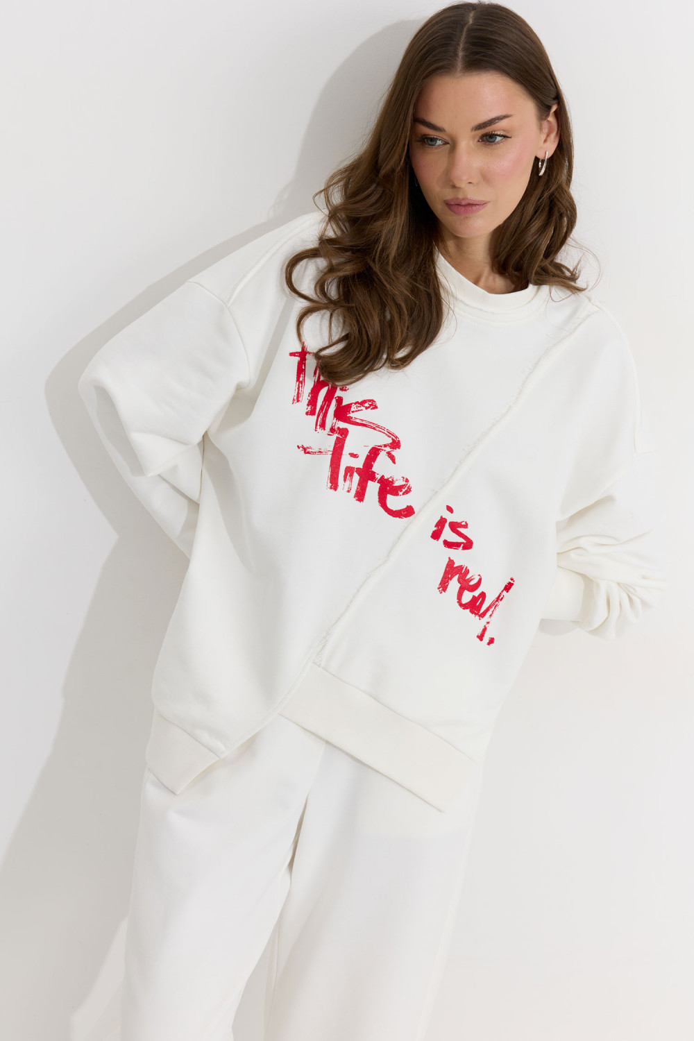 Ассиметричный джемпер прямого силуэта из трикотажного полотна. Горловина округлая. Рукав со спущенной линией плеча . По переду и спинке декоративный шов, по низу пояс с нашивкой. По низу джемпера и рукава декоративная сетка.