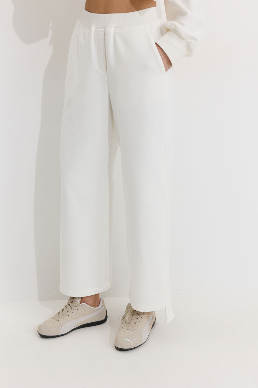 Брюки прямого силуэта из трикотажного полотна. По верху брюк притачной пояс. По боковым швам лампасы. По задним половинкам брюк карманы. Обращаем ваше внимание, что фурнитура может отличаться от фото.Подходит на рост 164-170 см.