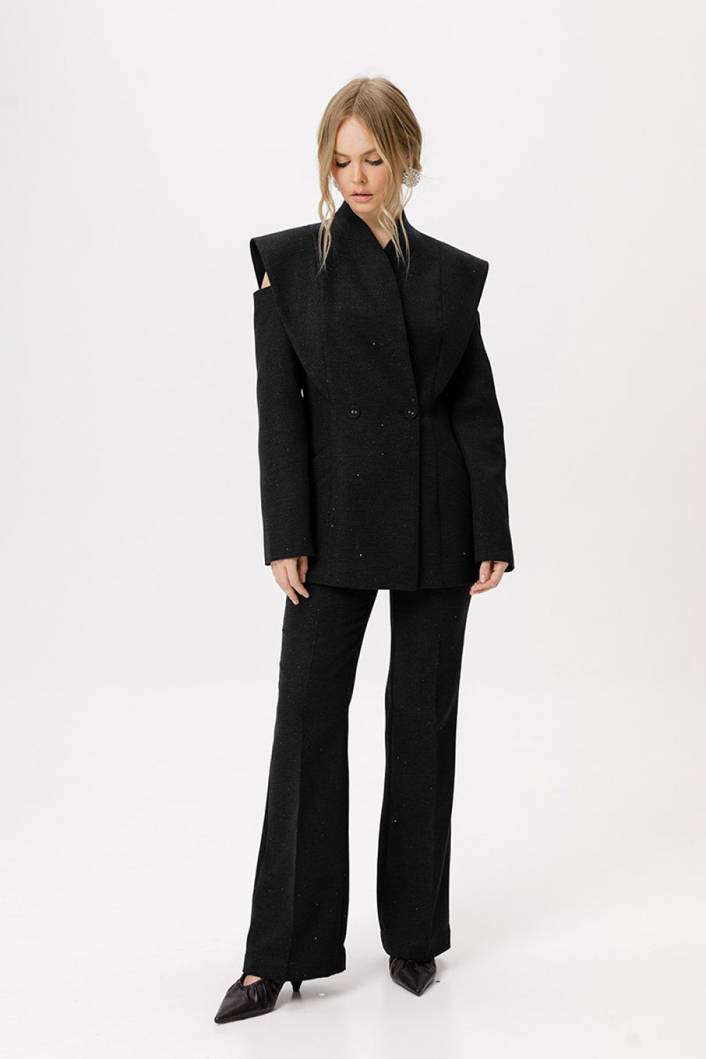 Костюм-двойка из приталенного двубортного жакета и облегающих брюк-клёш со стрелками.