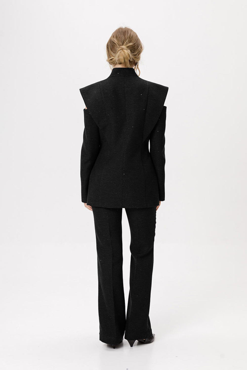Детали: полуприлегающий силуэт, цельнокроеный воротник-стойка, двубортная застёжка на петли и пуговицы, рельефные швы переда и спинки с декоративным элементом, рукава длинные с вырезами по верху, функциональные карманы, жакет на подкладке. Брюки с притачным поясом со шлёвками, передние половинки с заутюженными стрелками, наклонные карманы, задние половинки с вытачками и заутюженными стрелками, застёжка на молнию и пуговицу с потайным крючком, пояс брюк прямой без резинки.