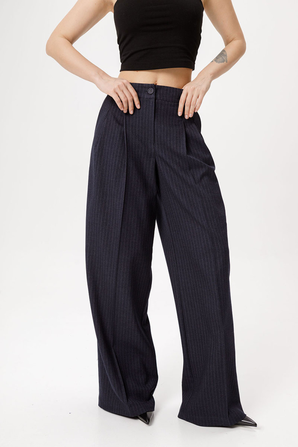 Костюм-двойка из укороченного оверсайз жакета с необработанным краем пройм и широких брюк-палаццо из текстильной ткани в полоску.
