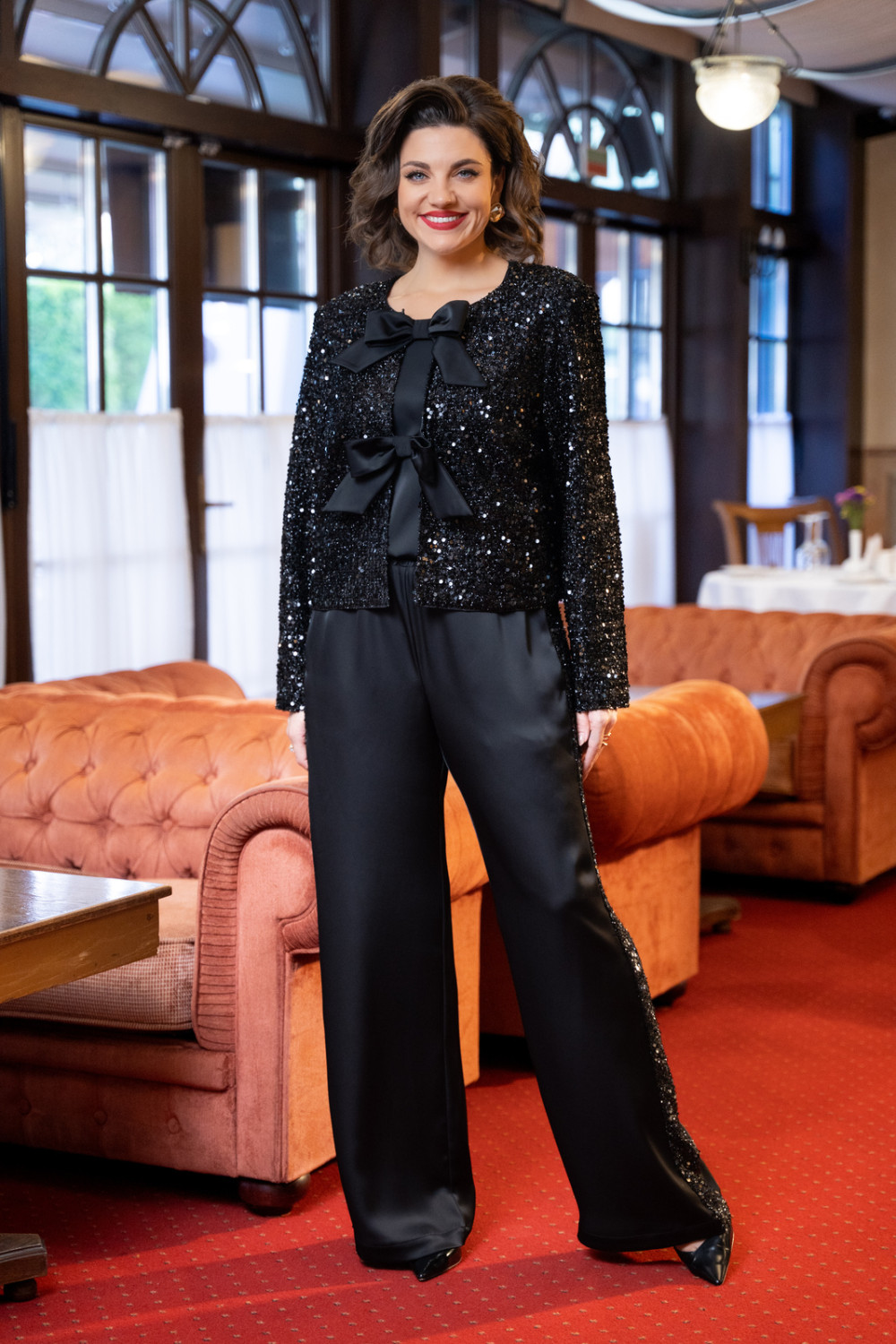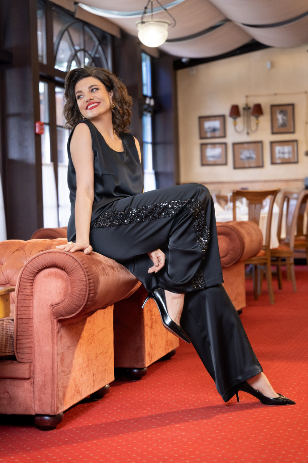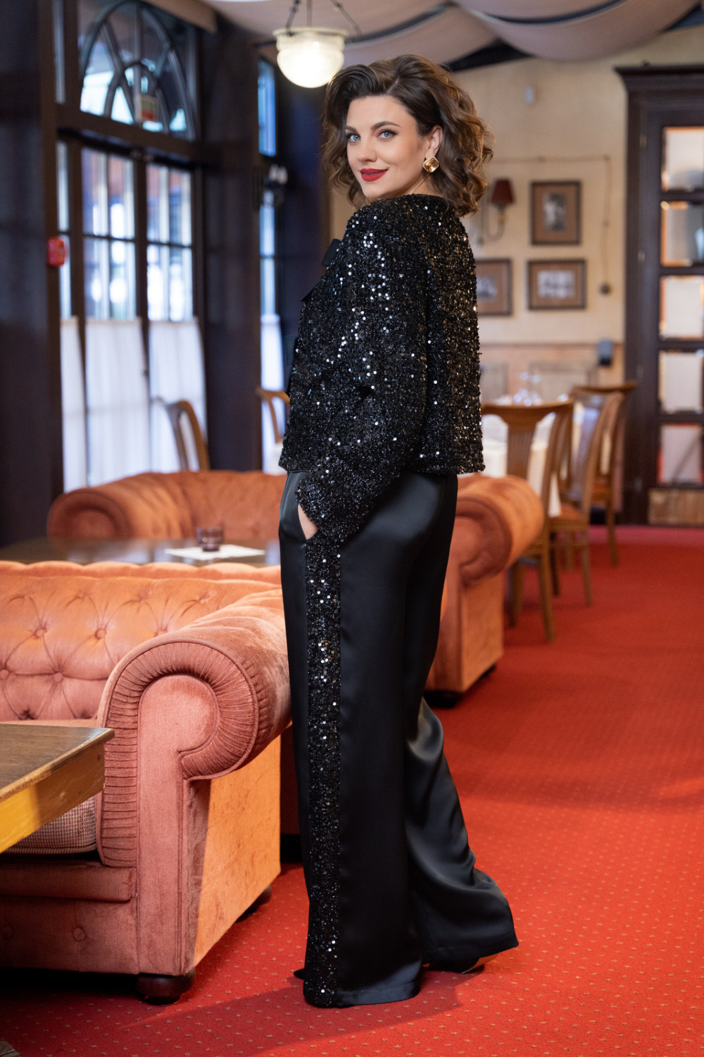 Комплект женский состоит из жакета, топа и брюк. Жакет прямого силуэта свободного покроя с естественной линией плеча на подкладке из атласной ткани. Горловина округлой формы. БАНТЫ СЪЁМНЫЕ! Застежка на съемные декоративные авторские банты с применением потайного крепления на небольшие кнопки, для возможности создания различных образов, как с бантами, так и без них. Топ свободного покроя. Горловина округлой формы. Проймы и горловина окантованы. Брюки свободные расширенного силуэта. По бокам выполнены лампасы из полотна с пайетками. Пояс притачной на резинке. В боковых швах карманы.