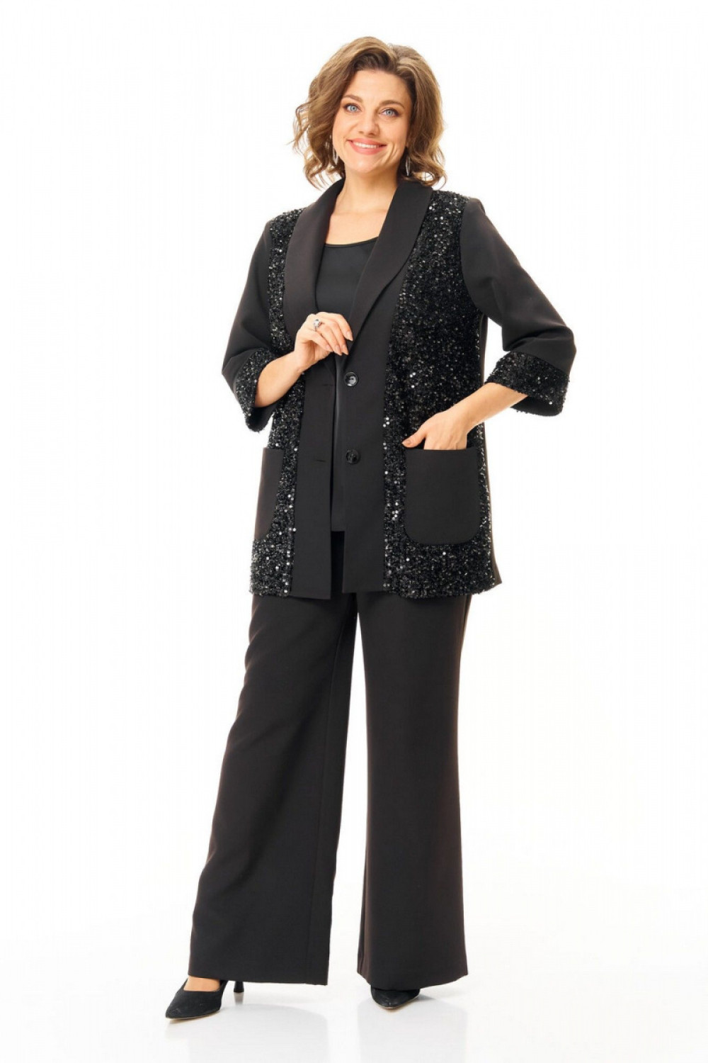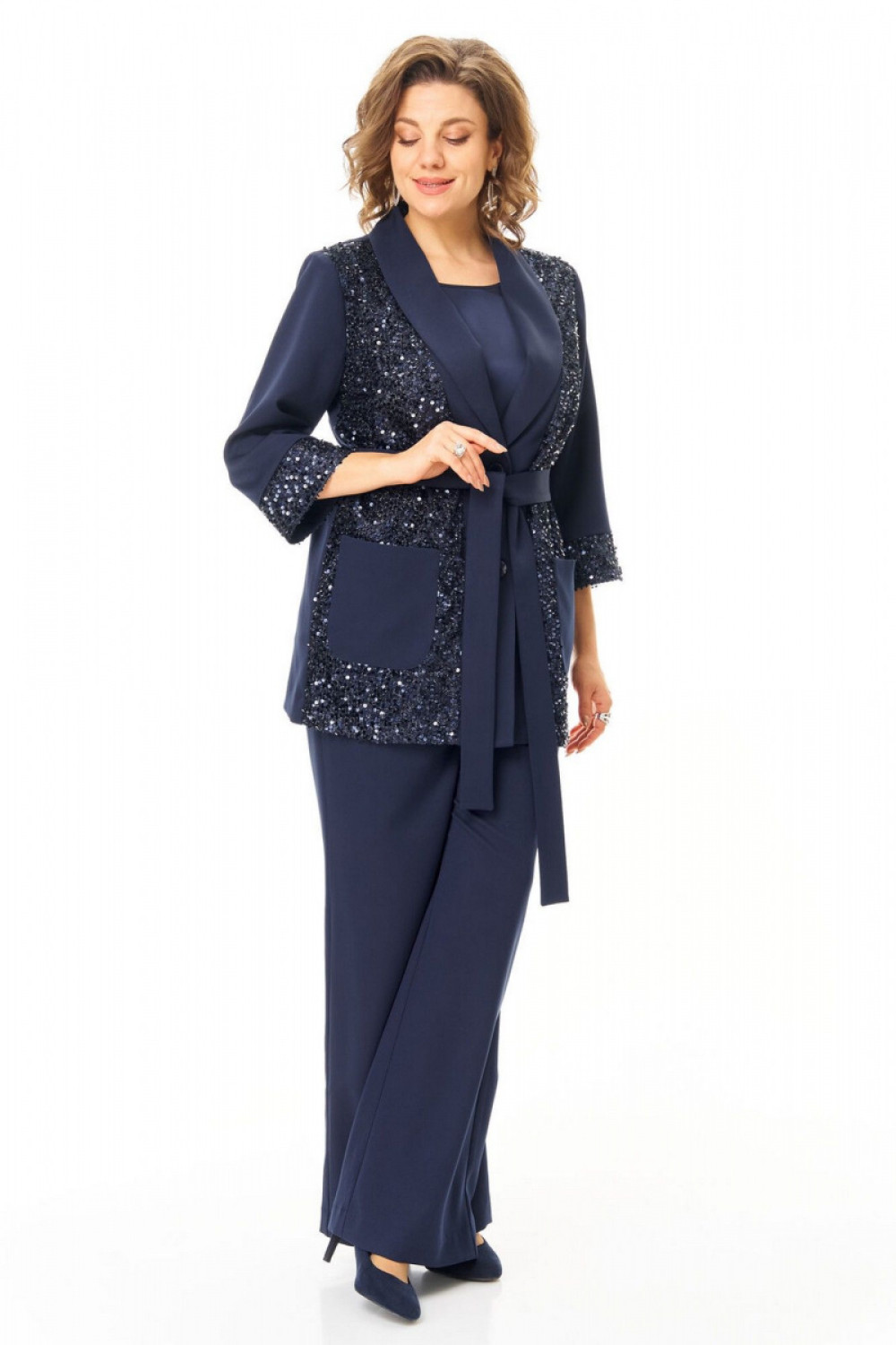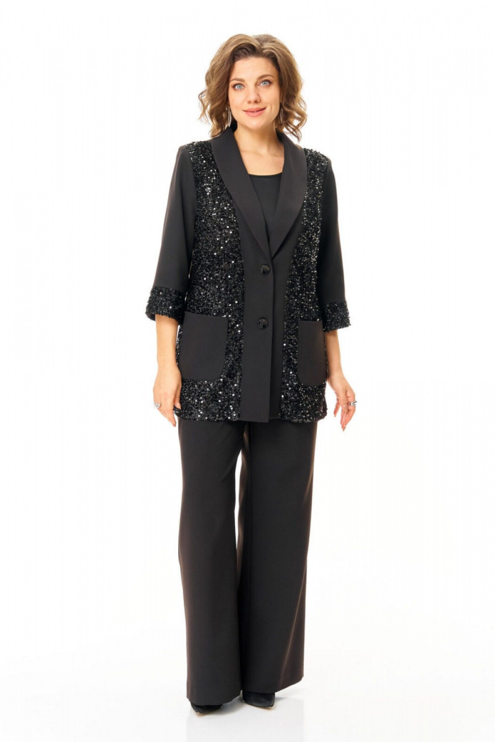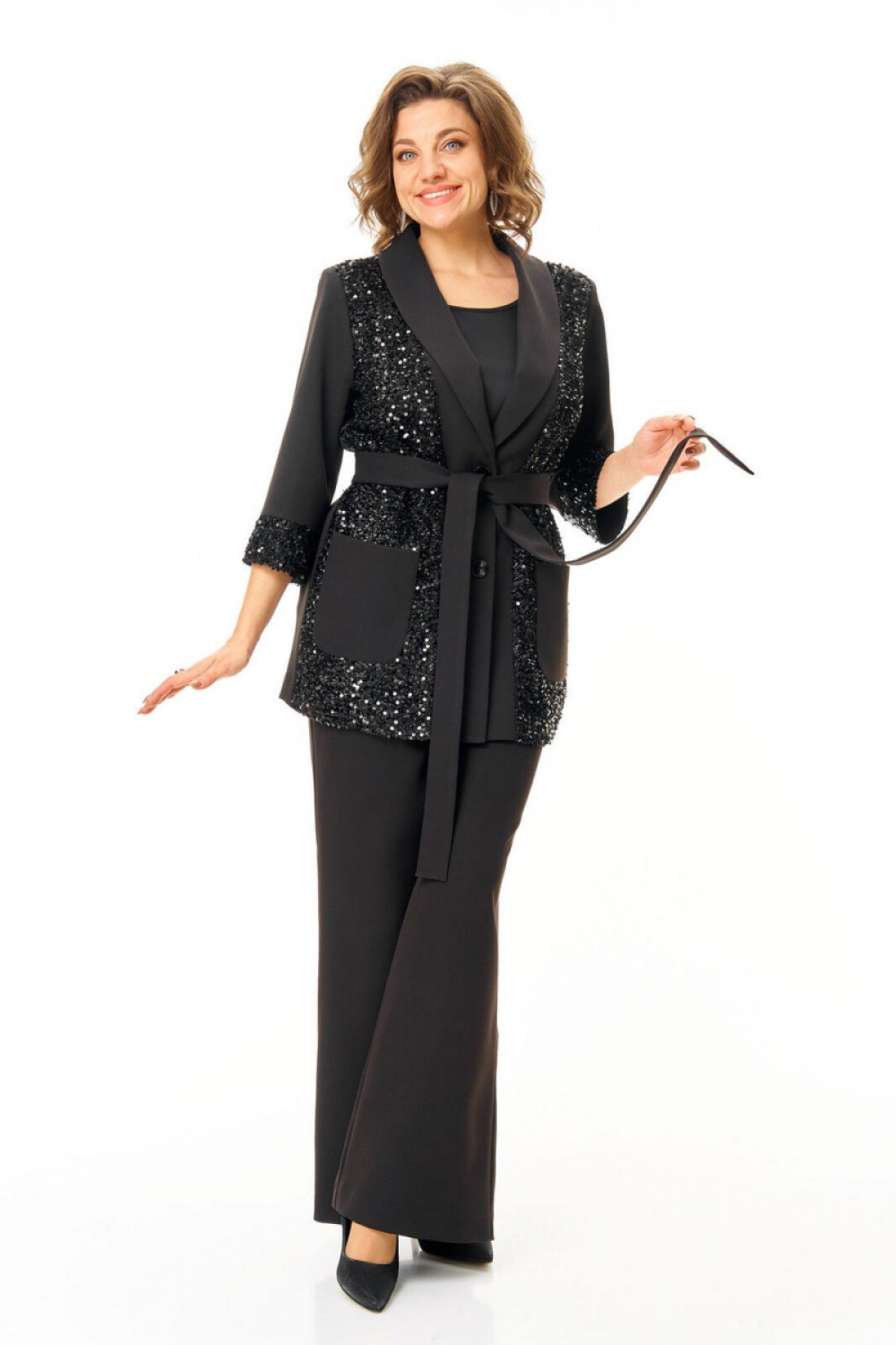 Комплект женский состоит из жакета, топа и брюк. Жакет свободного покроя с естественной линией плеча. Рукав втачной одношовный длиной 3/4 с манжетой из отделочной ткани "пайетки". Перед выполнен из отделочной ткани "пайетки" на атласной подкладке. Обработаны отрезные планки. Застежка центрально-бортовая на петли пуговицы. Воротник отложной типа "шаль". На переде выполнены накладные карманы. Топ свободного покроя из атласной ткани. Горловина округлой формы. Брюки расширенные к низу типа "палаццо" с центральной застёжкой на молнию и петлю-пуговицу. В боковых швах карманы с отрезным бочком. Пояс притачной с резинкой по задней части пояса. В комплект входит съёмный пояс.