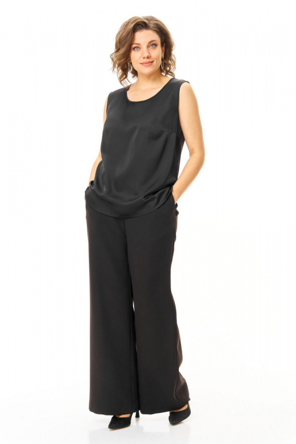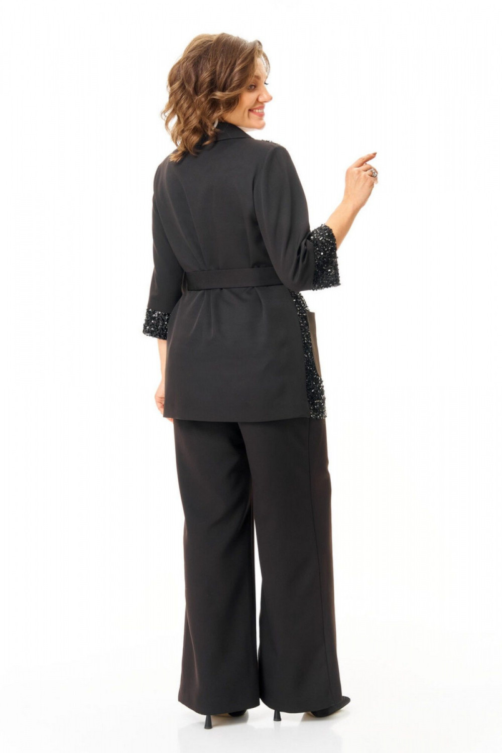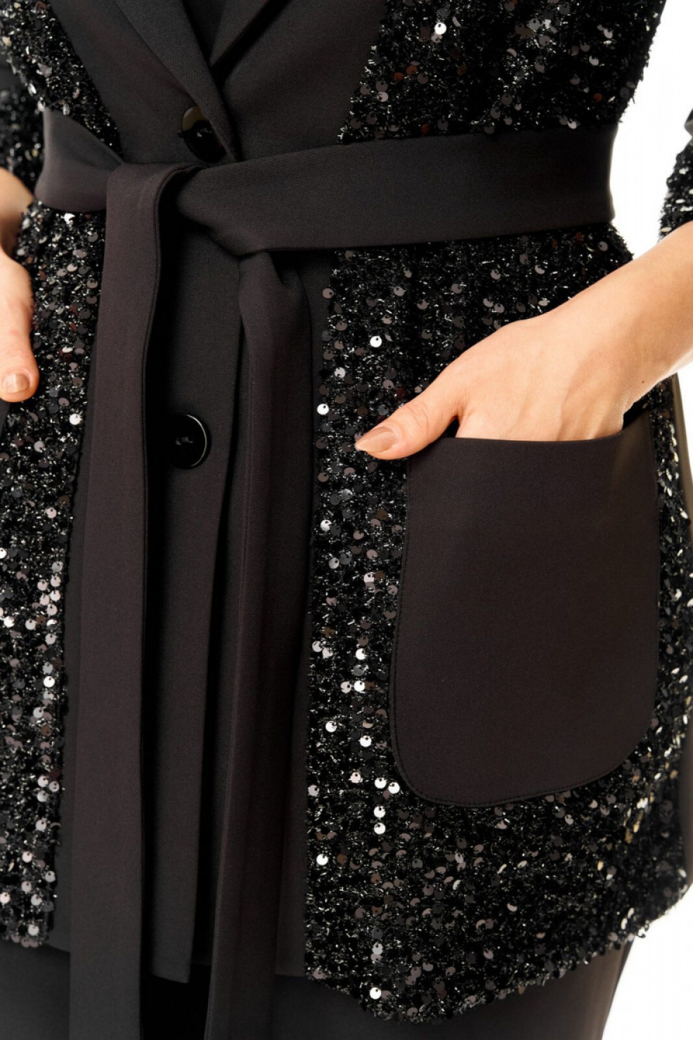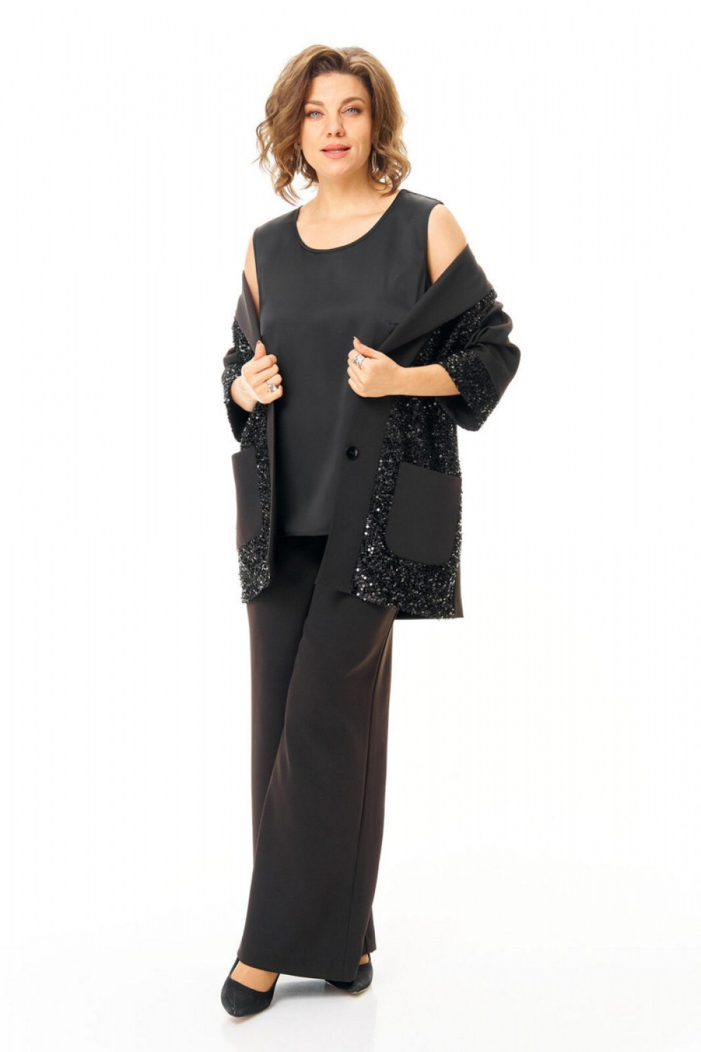 Комплект женский состоит из жакета, топа и брюк. Жакет свободного покроя с естественной линией плеча. Рукав втачной одношовный длиной 3/4 с манжетой из отделочной ткани "пайетки". Перед выполнен из отделочной ткани "пайетки" на атласной подкладке. Обработаны отрезные планки. Застежка центрально-бортовая на петли пуговицы. Воротник отложной типа "шаль". На переде выполнены накладные карманы. Топ свободного покроя из атласной ткани. Горловина округлой формы. Брюки расширенные к низу типа "палаццо" с центральной застёжкой на молнию и петлю-пуговицу. В боковых швах карманы с отрезным бочком. Пояс притачной с резинкой по задней части пояса. В комплект входит съёмный пояс.
