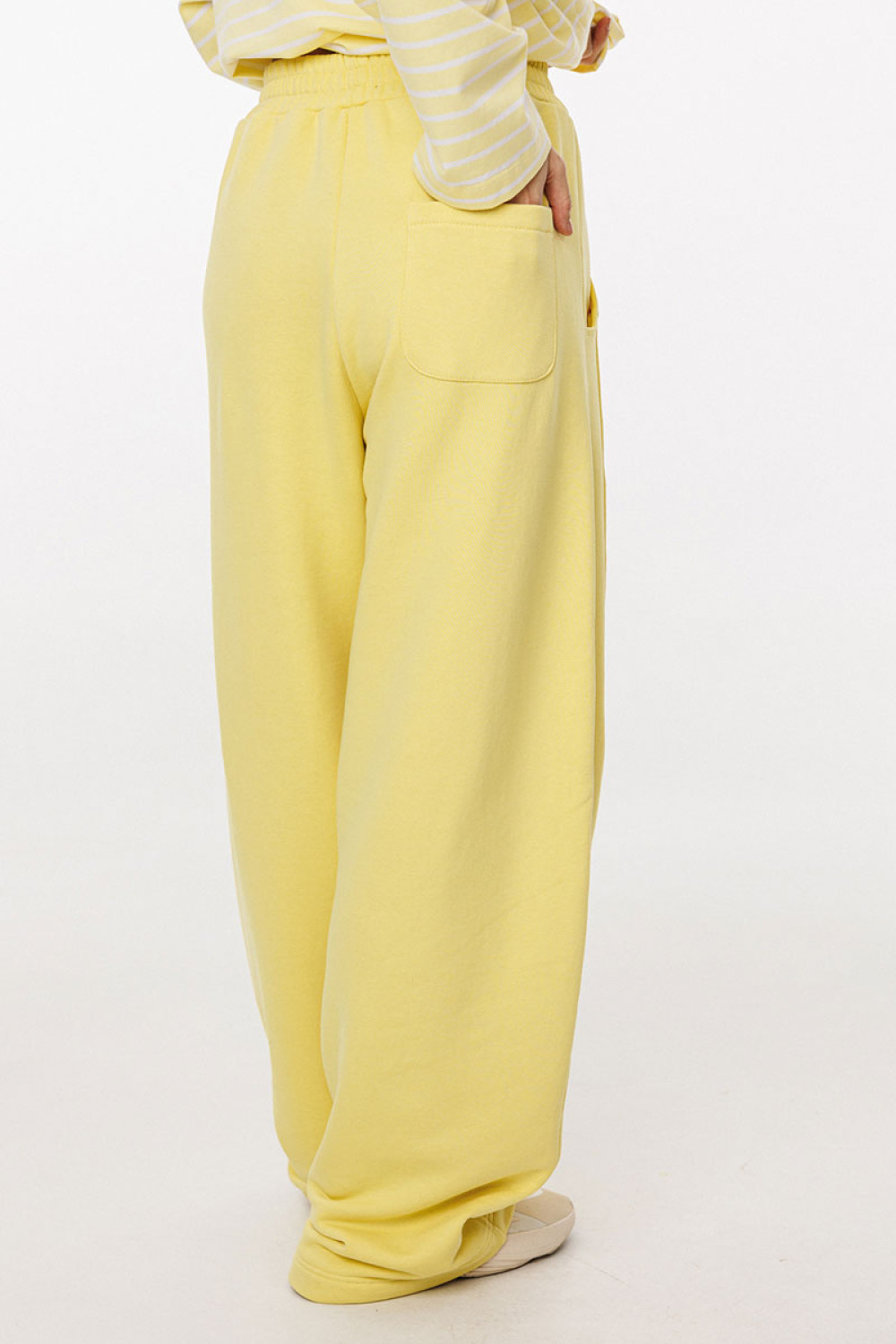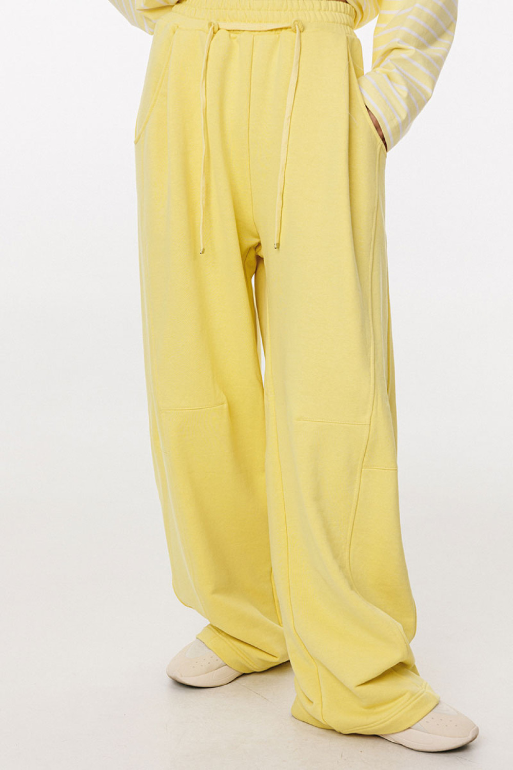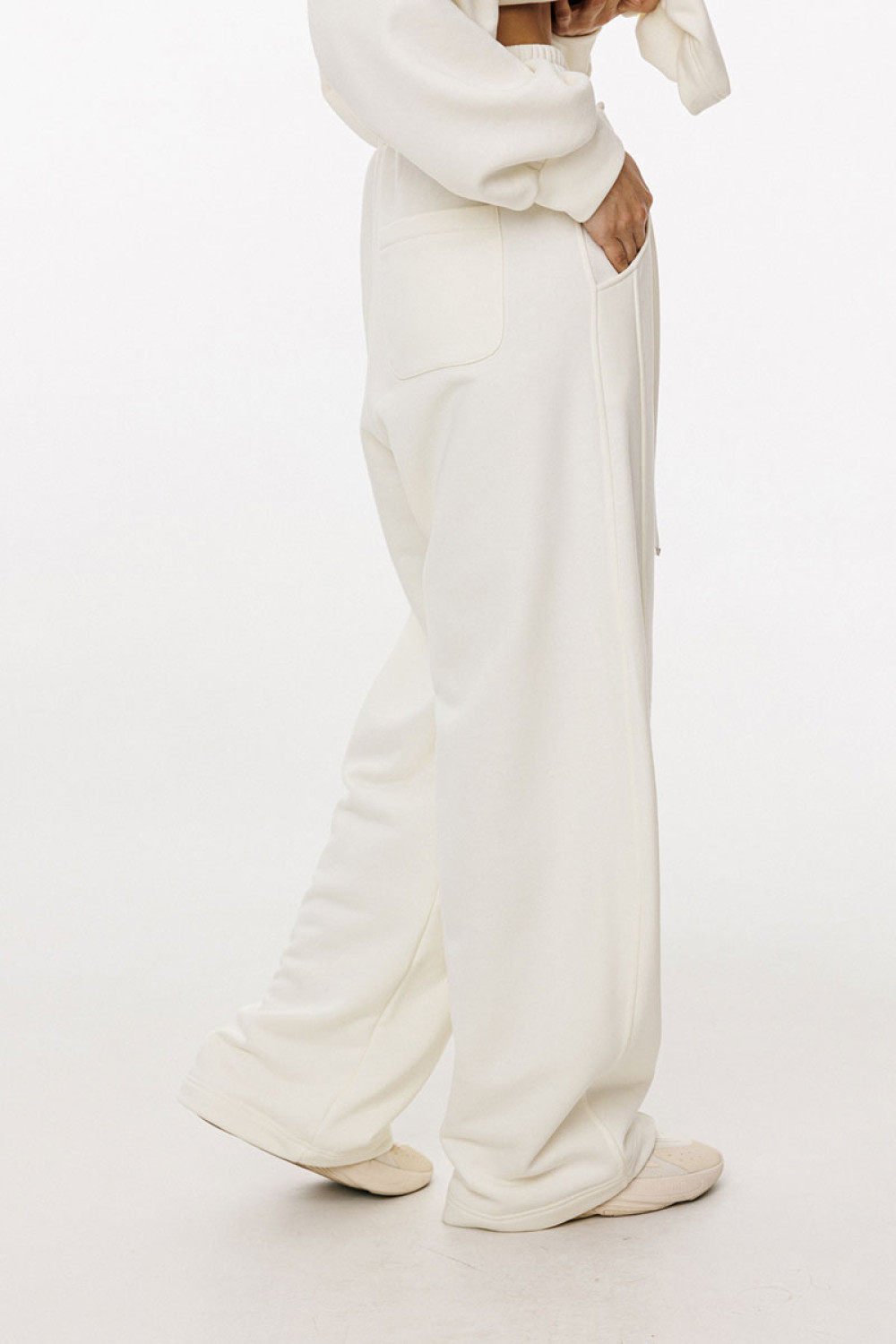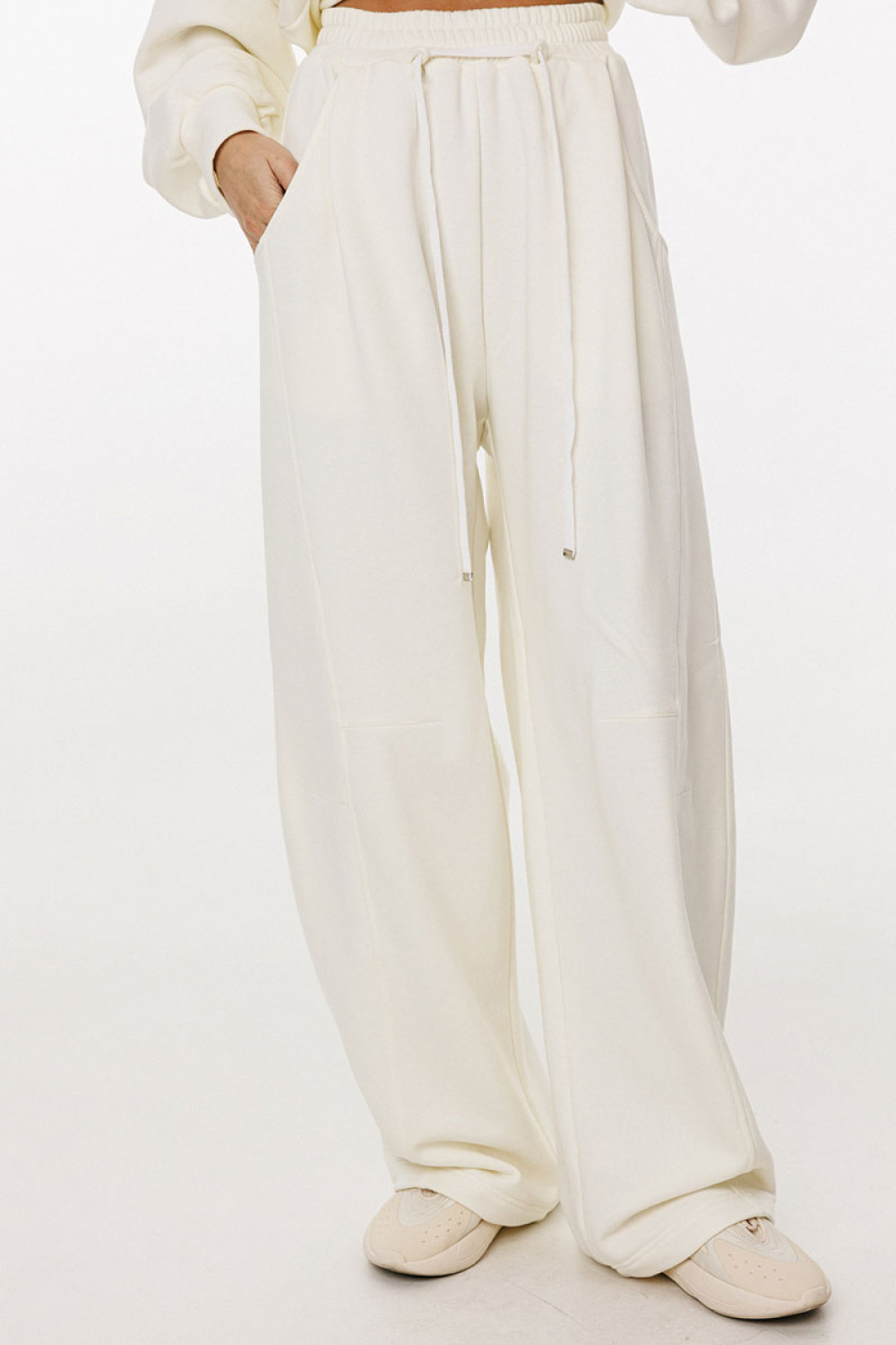 Брюки прямого силуэта, длиной в пол, на притачном поясе с эластичной тесьмой. Спереди боковые карманы с фигурным входом, петли в поясе, в которые втянут шнур из основной ткани, коленные вытачки, складки. Сзади справа накладной карман.