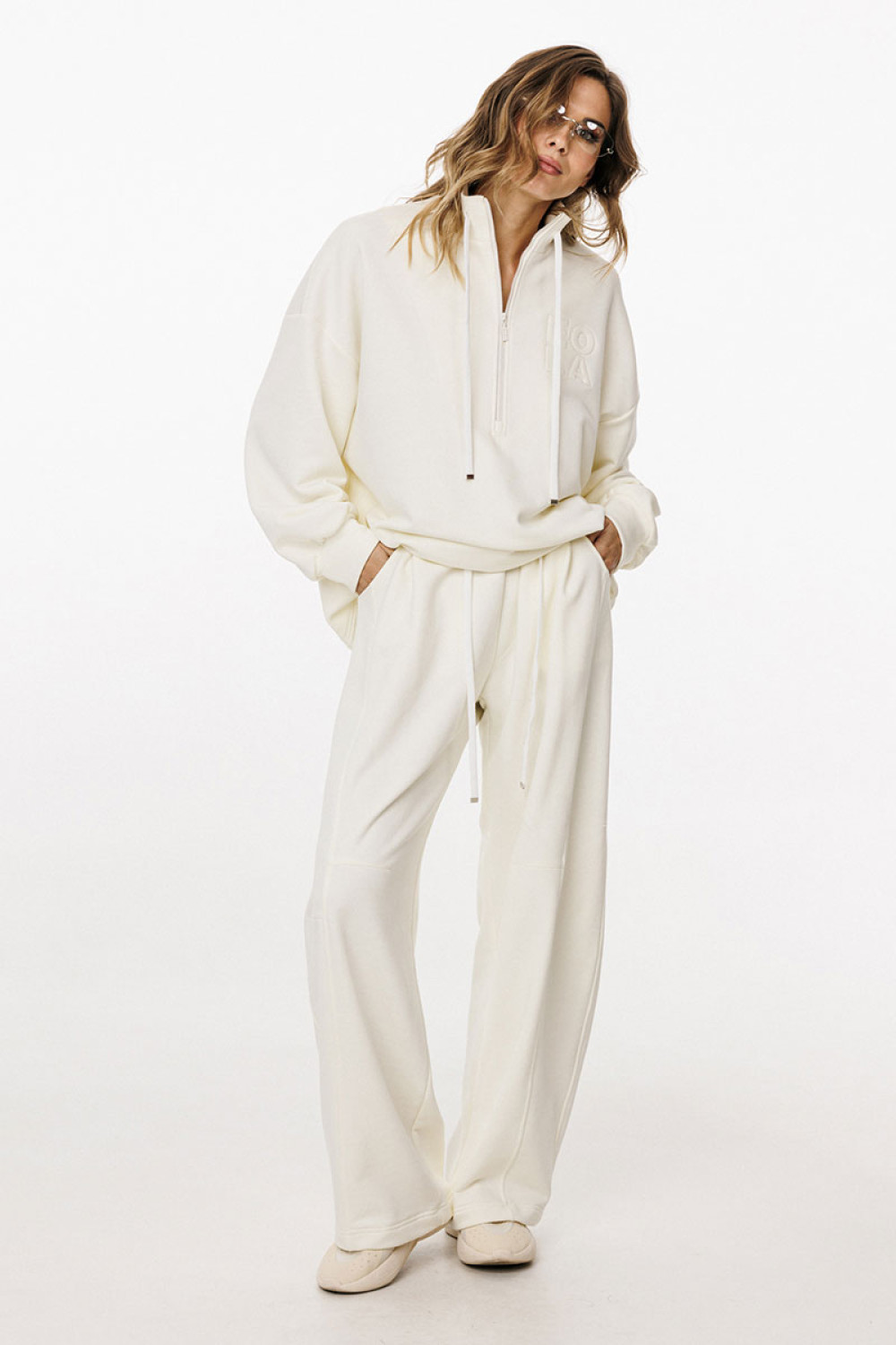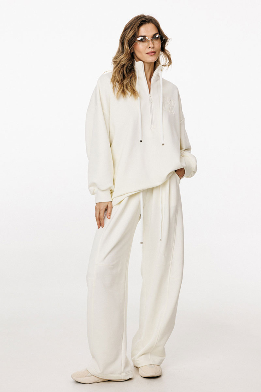 Джемпер прямого силуэта, покроя "oversize" длиной до линии бедер. Спереди застежка на молнию. Воротник-стойка. Плечевой шов удлинен. Рукав рубашечного покроя, одношовный, расширенный и присборенный к низу. Низ рукава на притачной манжете. Низ джемпера на эластичной тесьме с фиксаторами. Джемпер декорирован вышивкой по переду.