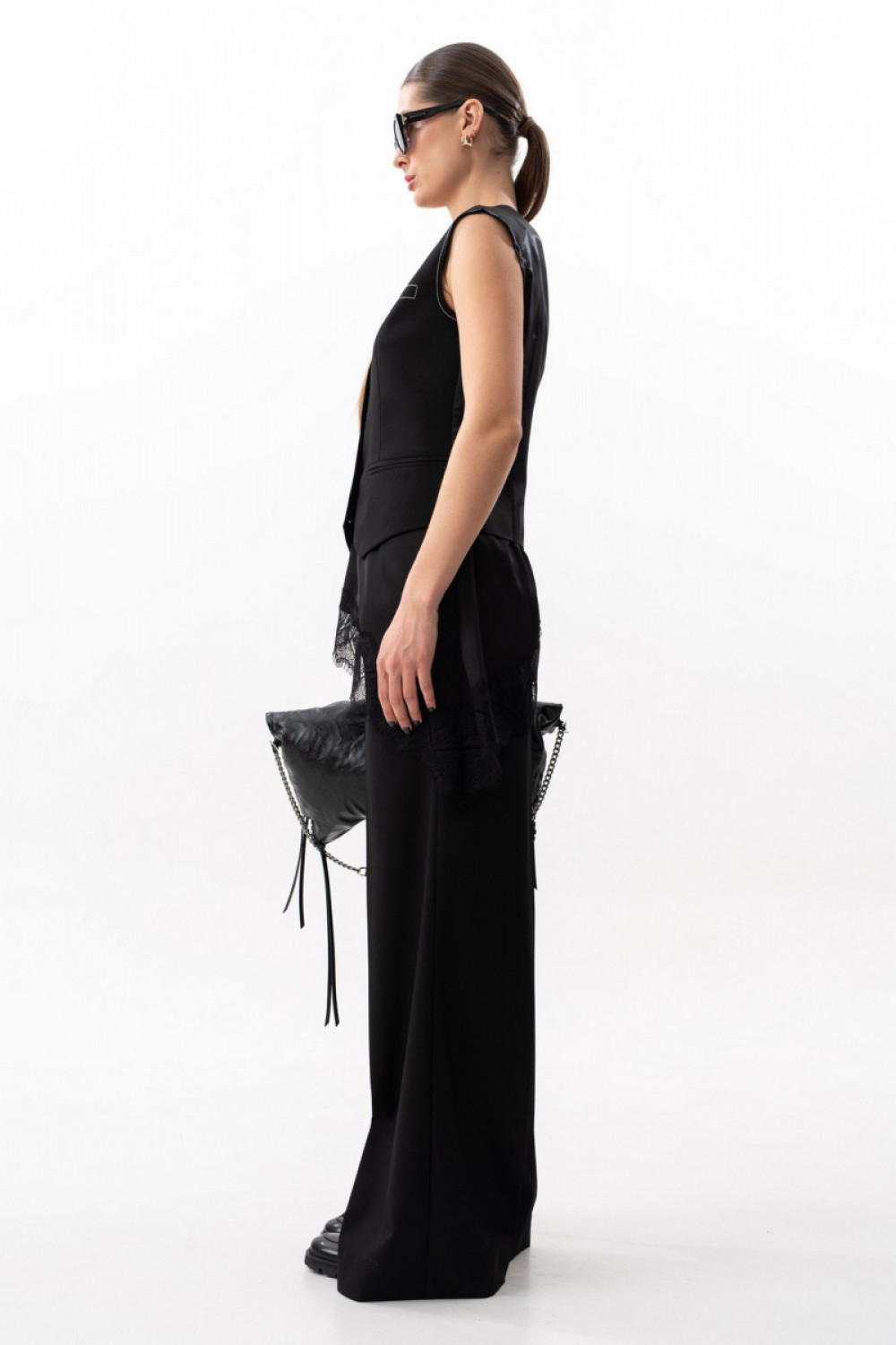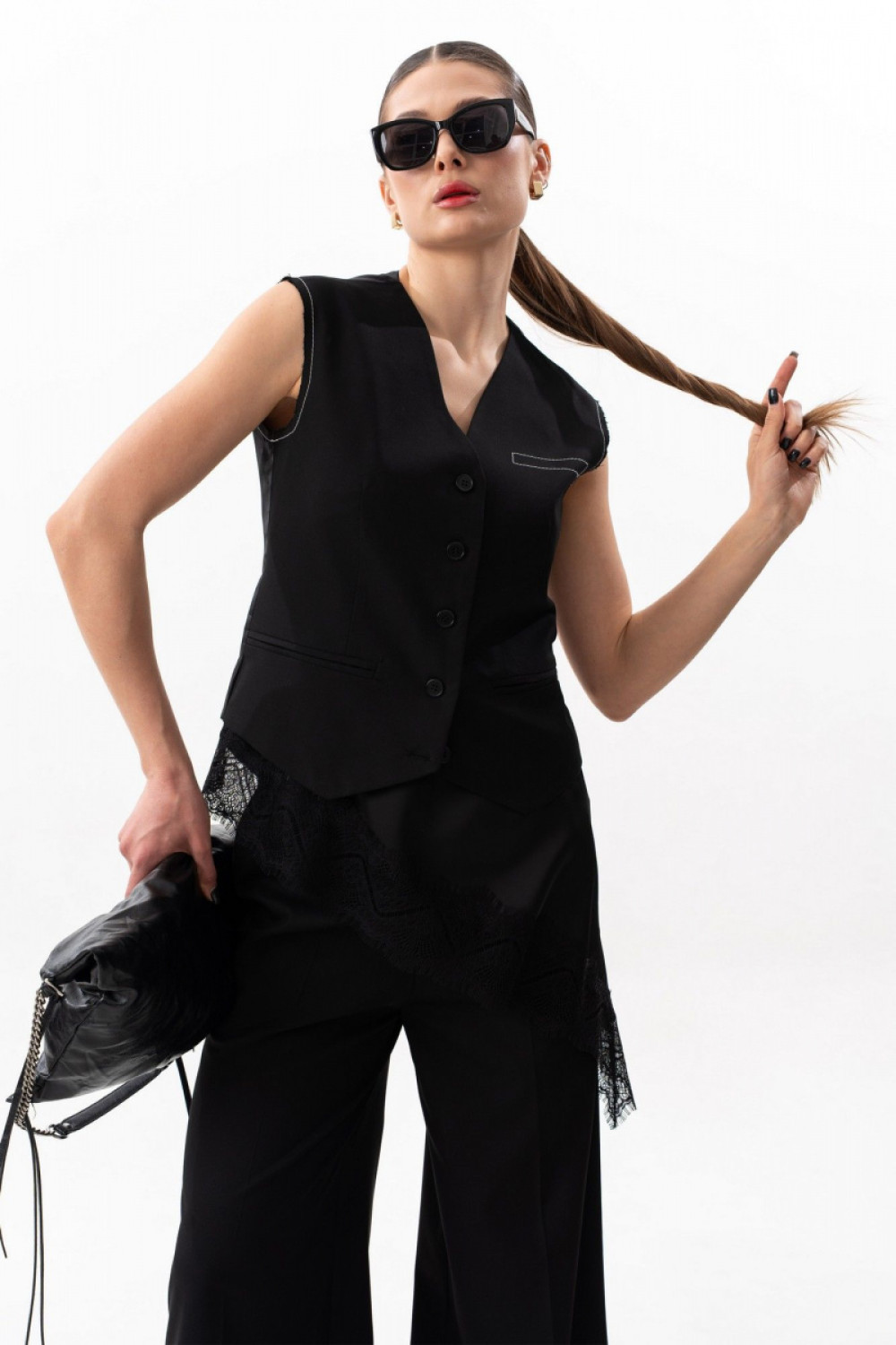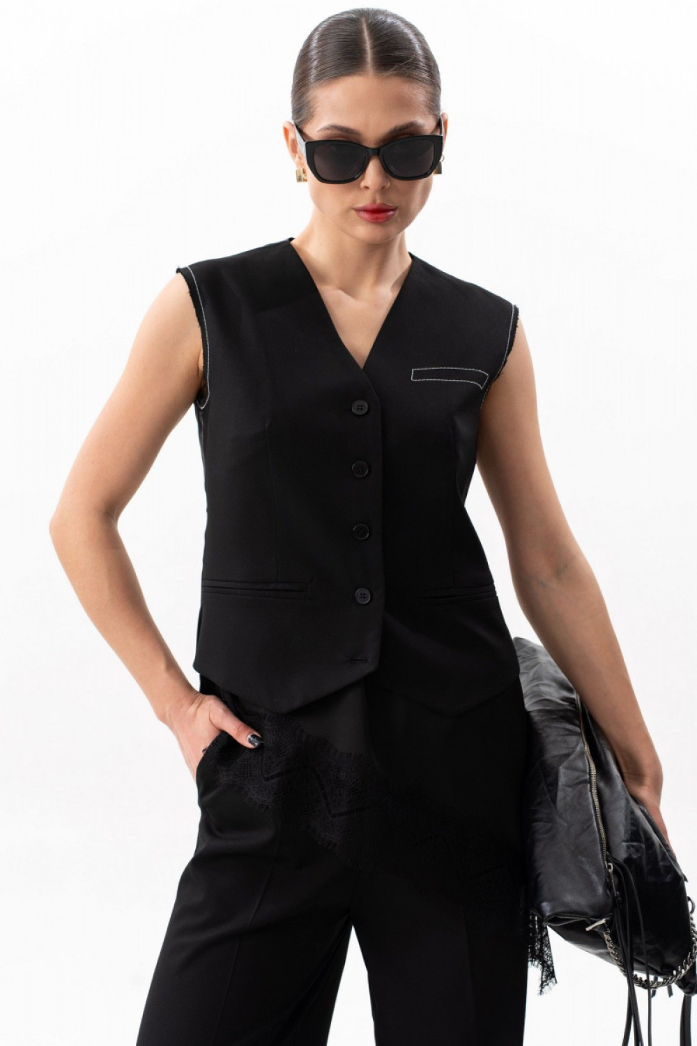 Жилет приталенного силуэта с нагрудной вытачкой, талиевыми вытачками и средним швом по спинке, на подкладке. Спинка выполнена из вискозной подкладочной ткани. Спереди прорезные карманы обманки, застежка центральная на петли - пуговицы. По переду фигурная линия низа. По линии проймы необработанный край (открытый срез), с простроченной отделочной контрастной нитью. На левой стороне полочки жилета вышивка контрастными нитками, имитирующая листочку. Жилет позволит создать множество стильных образов. Его можно носить как с топами(блузами), так же и самостоятельно. Длина жилета по среднему шву спинки 50,5 см. На фото: брюки S-3630, топ S-7635