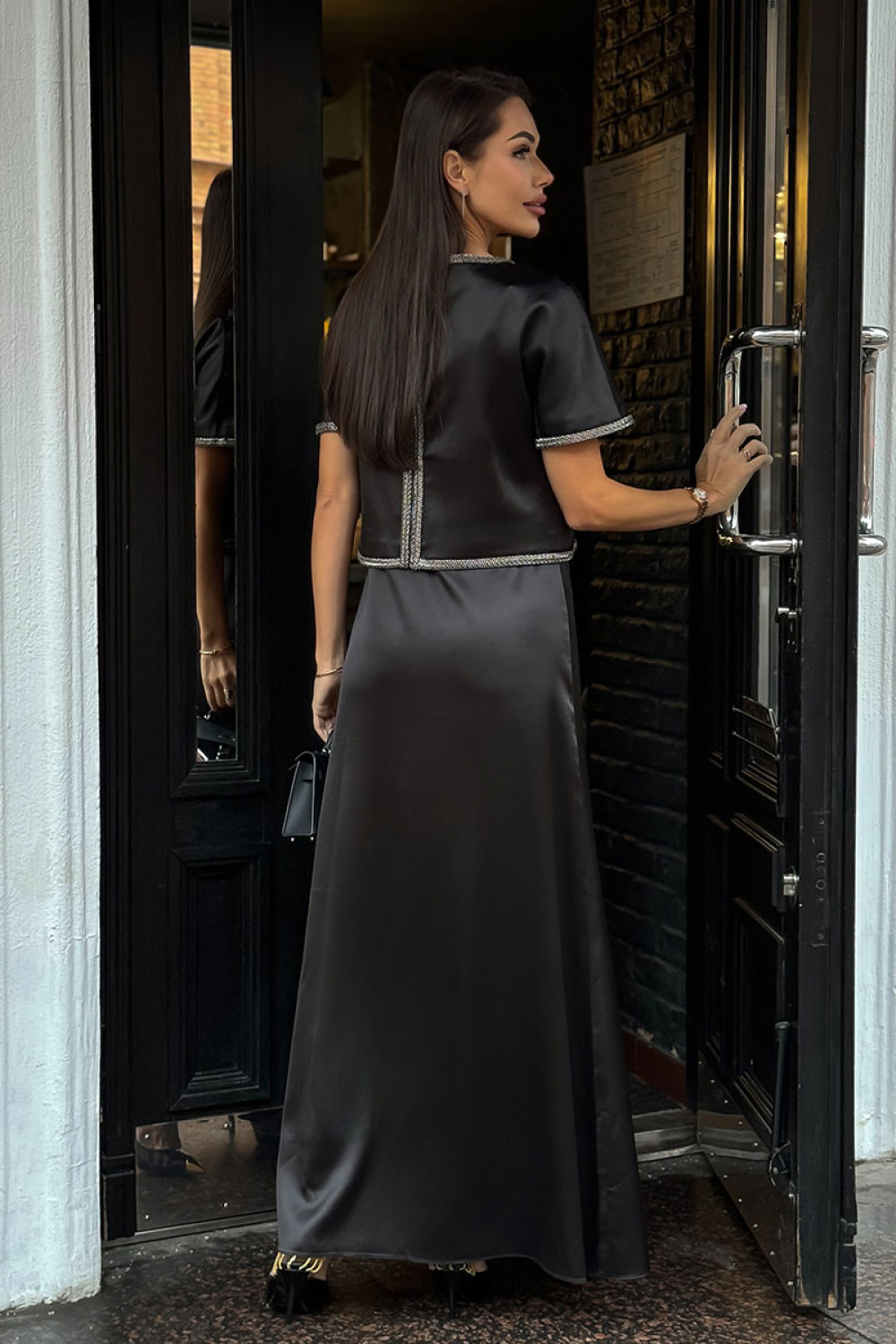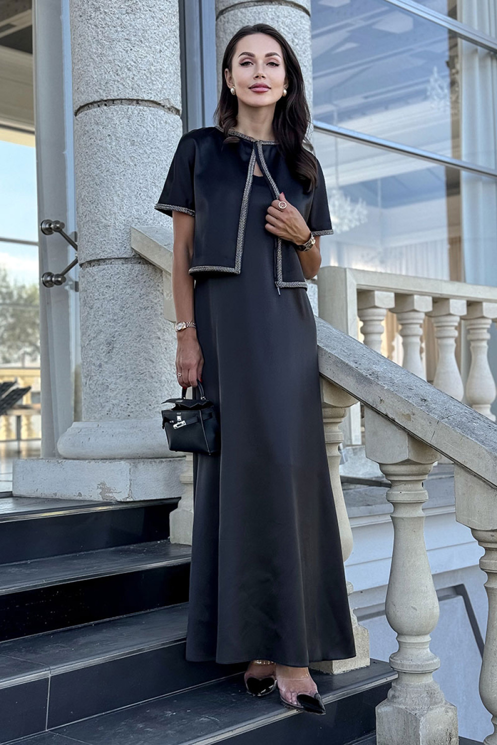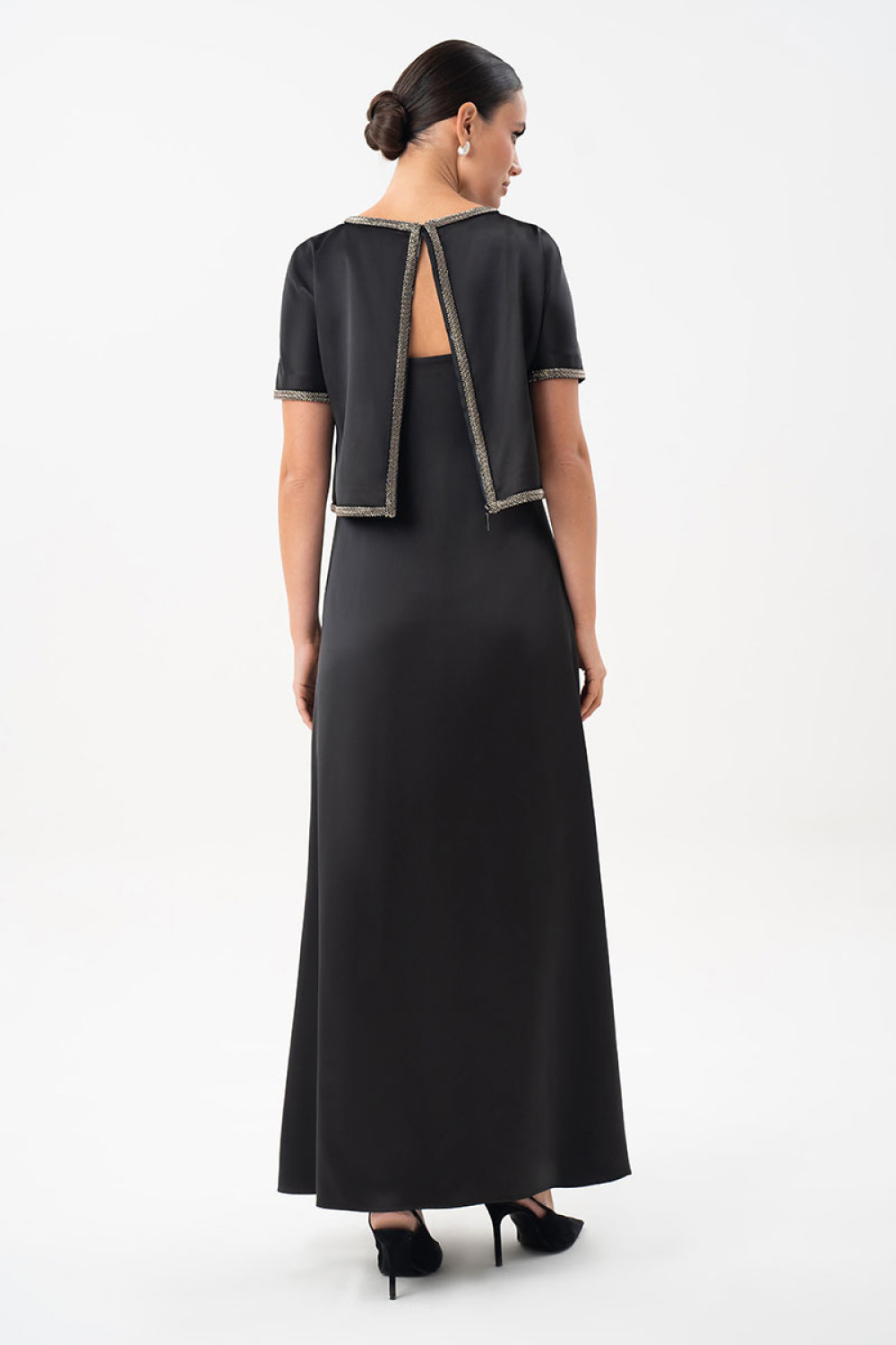 Низ переда, спинки и рукавов, горловина, застежка спинки вдоль молнии декорированы отделочной тесьмой из сетки с нашивными бусинами (размер и цвет фурнитуры может незначительно отличаться от фото).