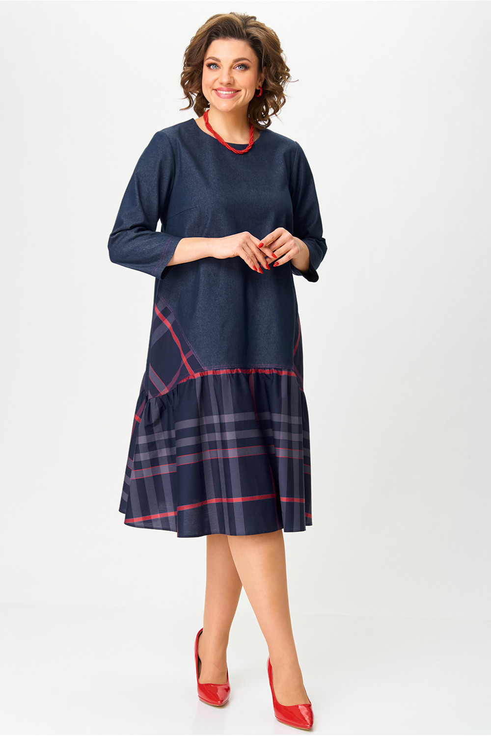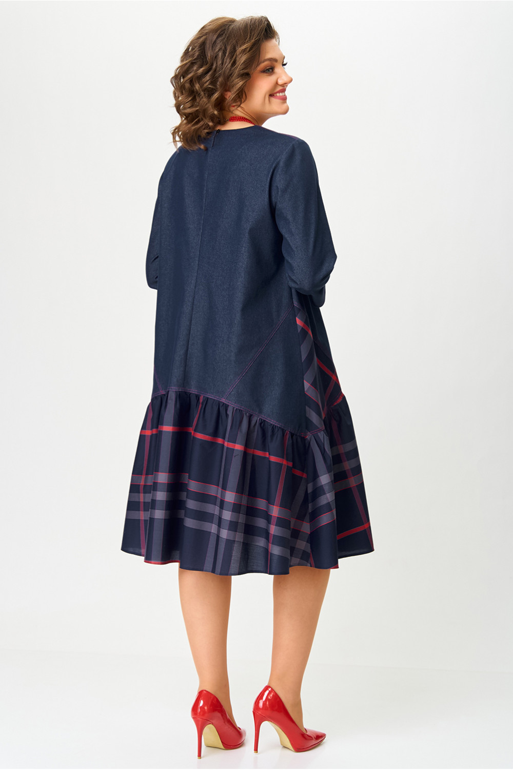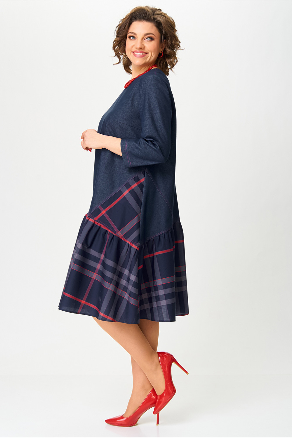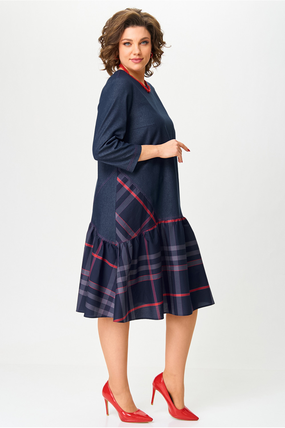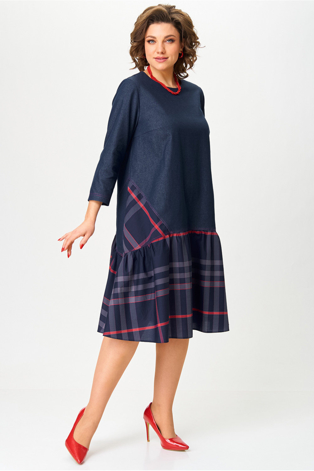 Это платье словно создано для лёгкости и свободы. Его свободный крой дарит комфорт, а сочетание глубокого синего с клетчатым рисунком добавляет динамику и характер. Диагональные вставки и присборенный низ создают эффект непринуждённости, при этом платье смотрится стильно и современно. Вырез горловины округлой формы, по переду нагрудные вытачки. Понизу два волана со сборкой по верхнему краю и декоративные вставки по бокам. Рукав втачной, одношовный.