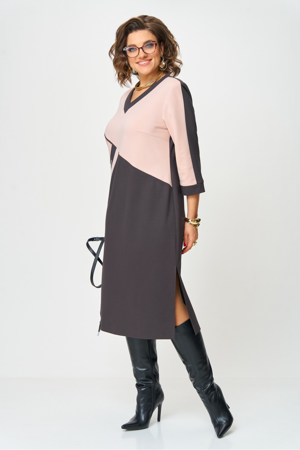 Это платье создано для женщины, которая ценит простоту и выразительность в каждой детали. Геометрический крой с диагональной вставкой не только привлекает внимание, но и визуально стройнит фигуру, создавая гармоничные линии силуэта. Платье прямого кроя длины - миди из трикотажного полотна. Горловина V-образной формы с контрастной отделкой, По переду ассиметричный карман, Рукав длиной 3/4 с манжетой по низу. Спинка со средним швом без особенностей, в правом боковом шве разрез. Мягкий пудрово-розовый оттенок верха красиво сочетается с глубоким шоколадным низом, подчеркивая изысканность и современный характер модели. Контрастная отделка добавляет динамики, а удобный крой позволяет чувствовать себя уверенно в течение всего дня.