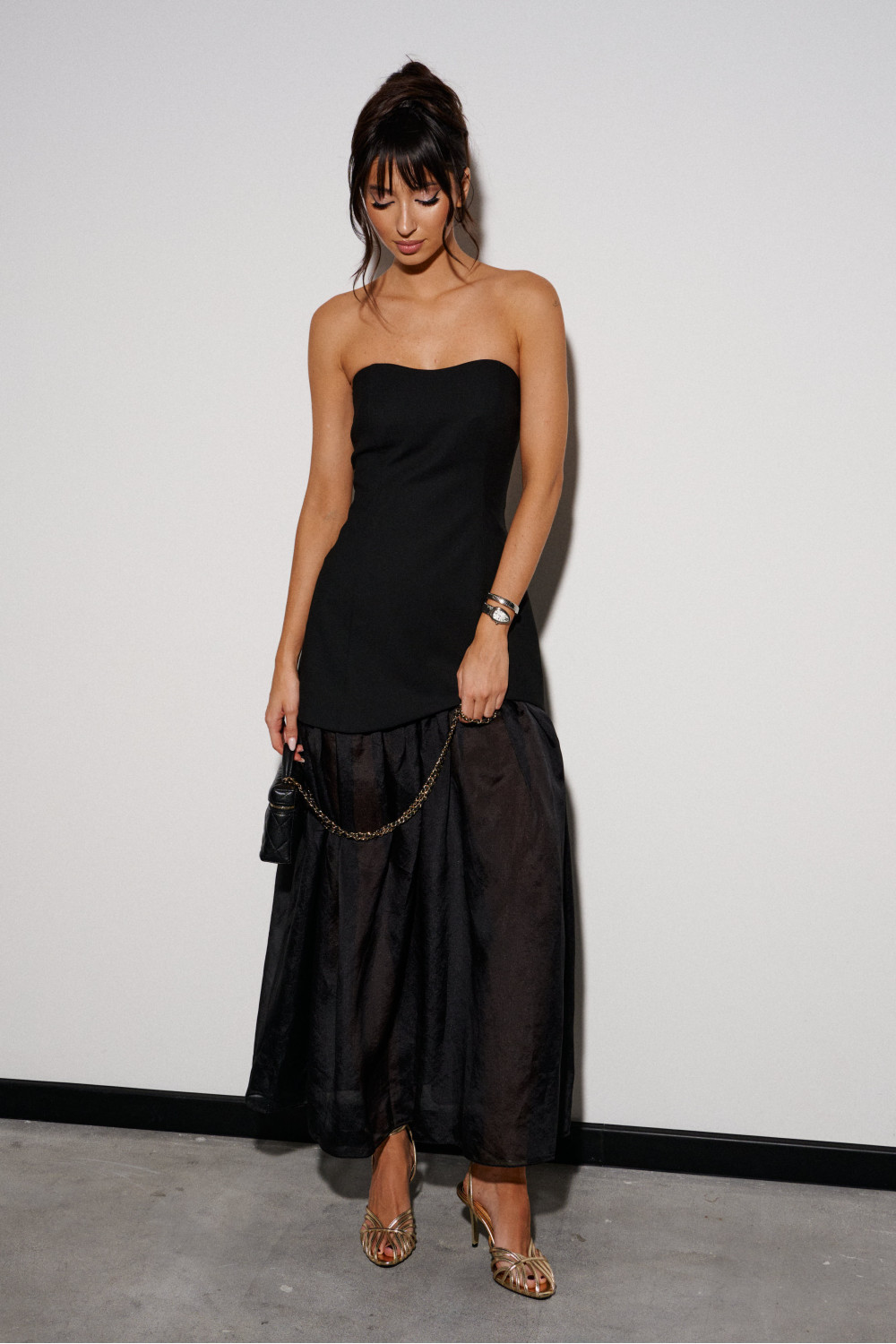 Платье выполнено из черной костюмной ткани и мягкой органзы. Характеристики: верх корсетного типа, на брендированной подкладке, юбочная часть выполнена из мягкой органзы, сзади по центру потайная молния.