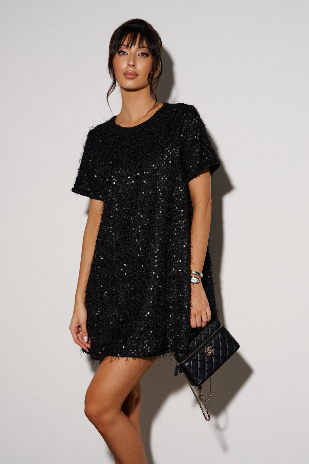 Платье свободного силуэта. Выполнено из фактурного ворсистого полотна с пайетками в черном цвете. Горловина овальная, рукав втачной, застежка на петлю пуговичку на спинке, рукав втачной, есть подкладка.
